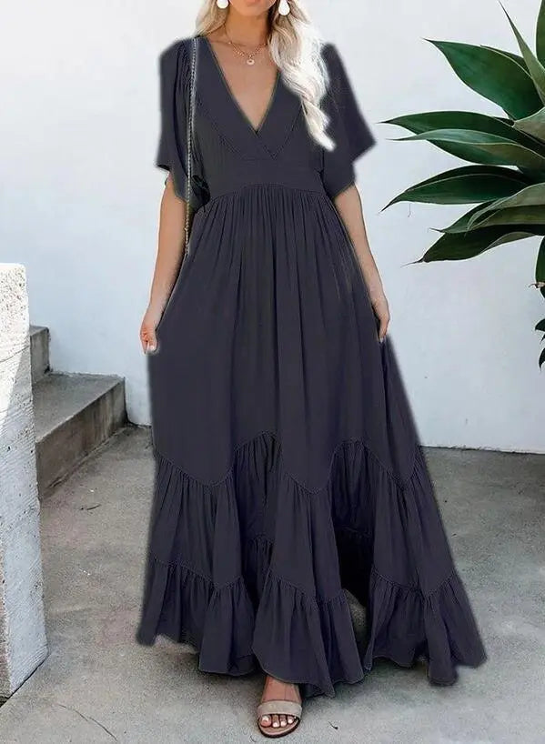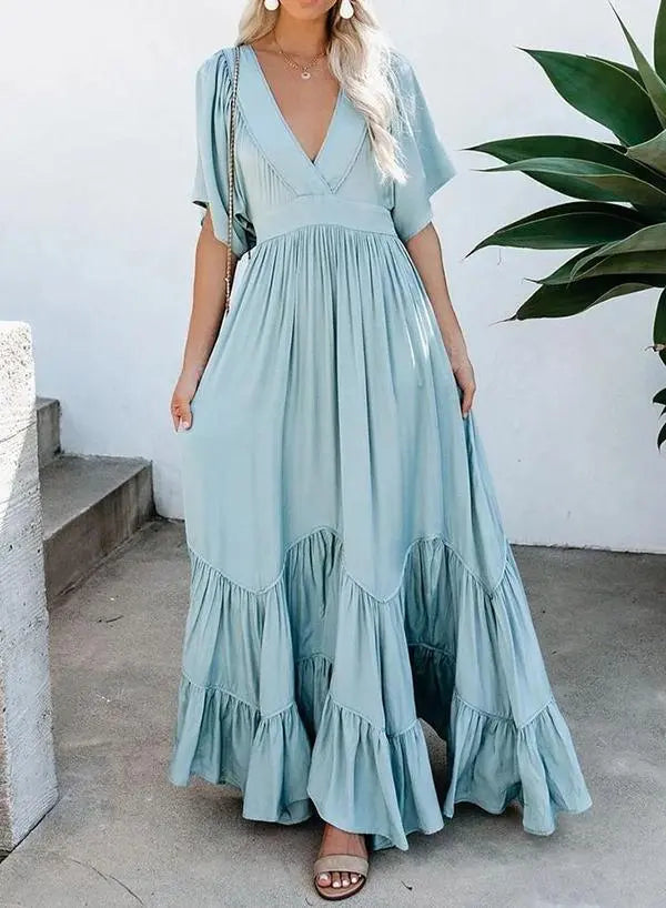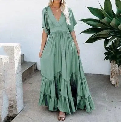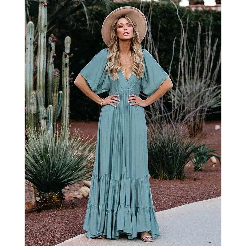 Geumxl nueva moda de verano Maxi vestido con cuello en V manga corta Color sólido vestido largo hasta el suelo A-Line vacaciones general Vestidos Boho batas