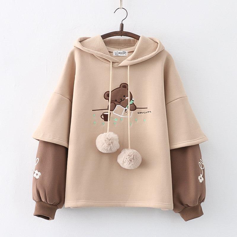 Suéter japonés Mori de invierno con forro polar grueso bordado pintura oso con capucha suéter de mujer