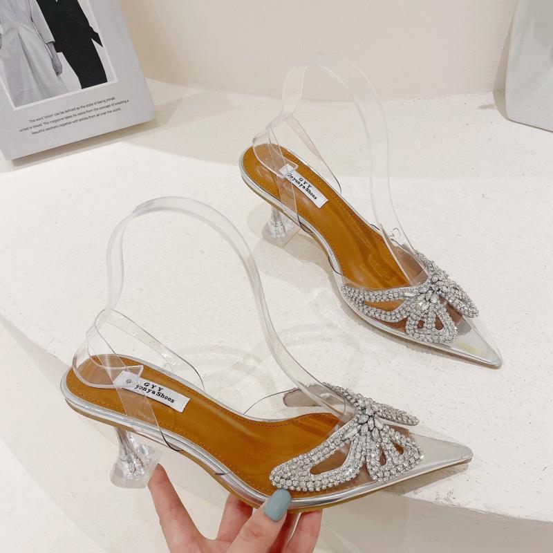 Zapatos de mujer con punta puntiaguda y puntera transparente con lazo de diamantes de imitación