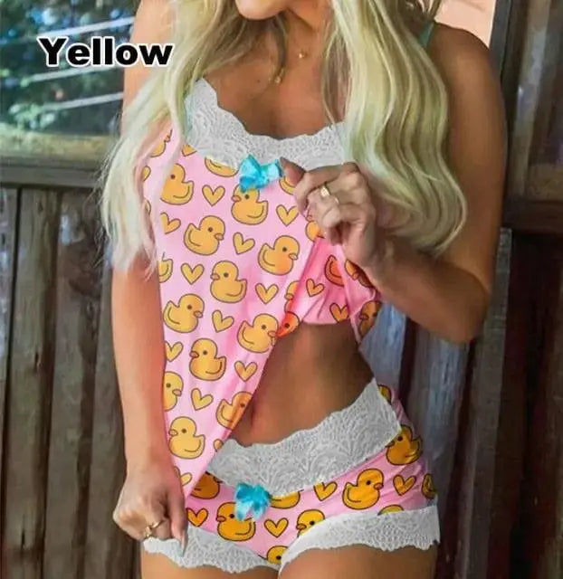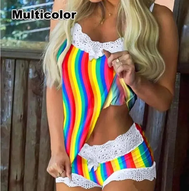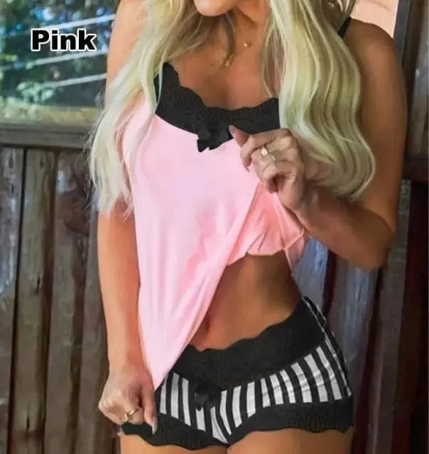 Conjunto de pijama de encaje Sexy para mujer, ropa de dormir con tirantes finos sin mangas y lazo, lencería dulce, camisones, conjunto de pantalones cortos para dormir para mujer