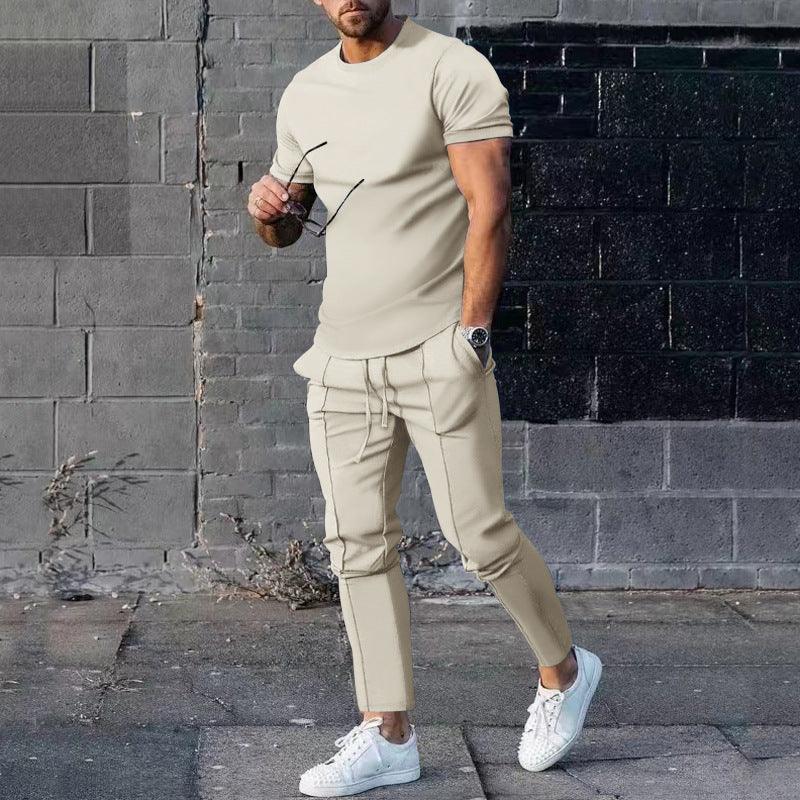 Conjunto de dos piezas de pantalones y camiseta de manga corta con cuello redondo informal de color liso