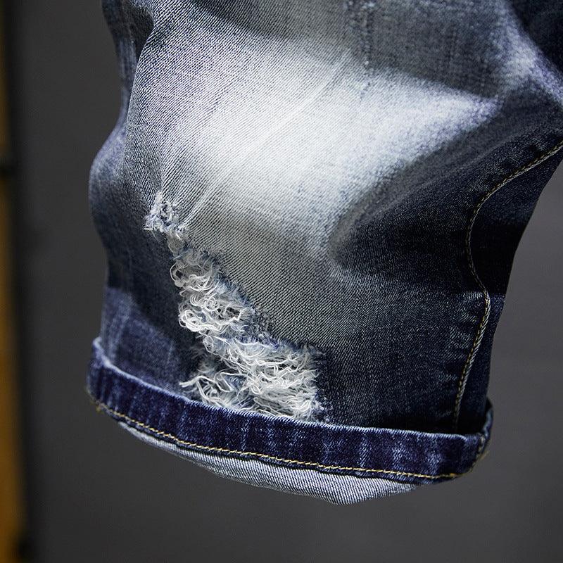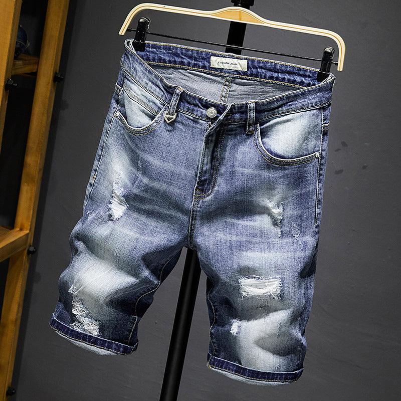 Novedad de verano, pantalones cortos de mezclilla de cueva rota para hombre, pantalones de tendencia europea y americana, pantalones cortos para hombre, pantalones vaqueros de cinco puntos para hombre