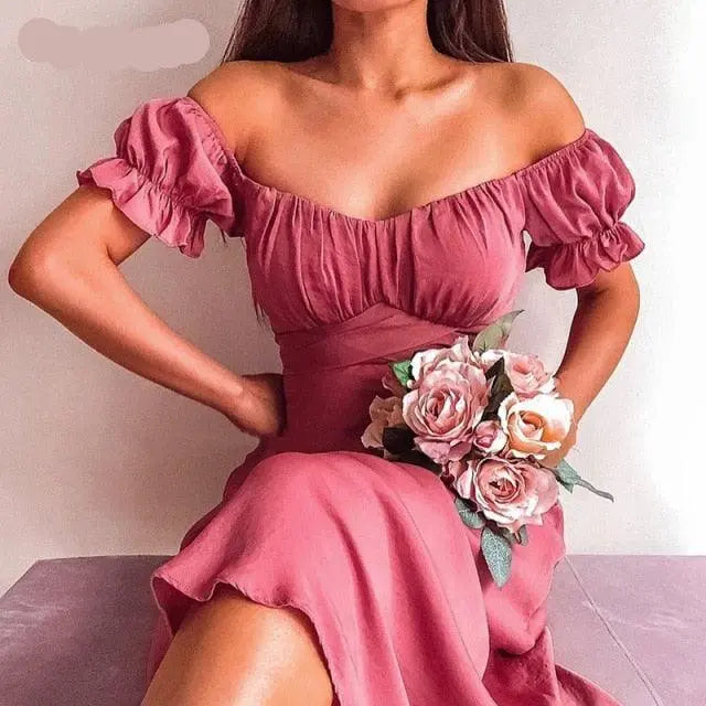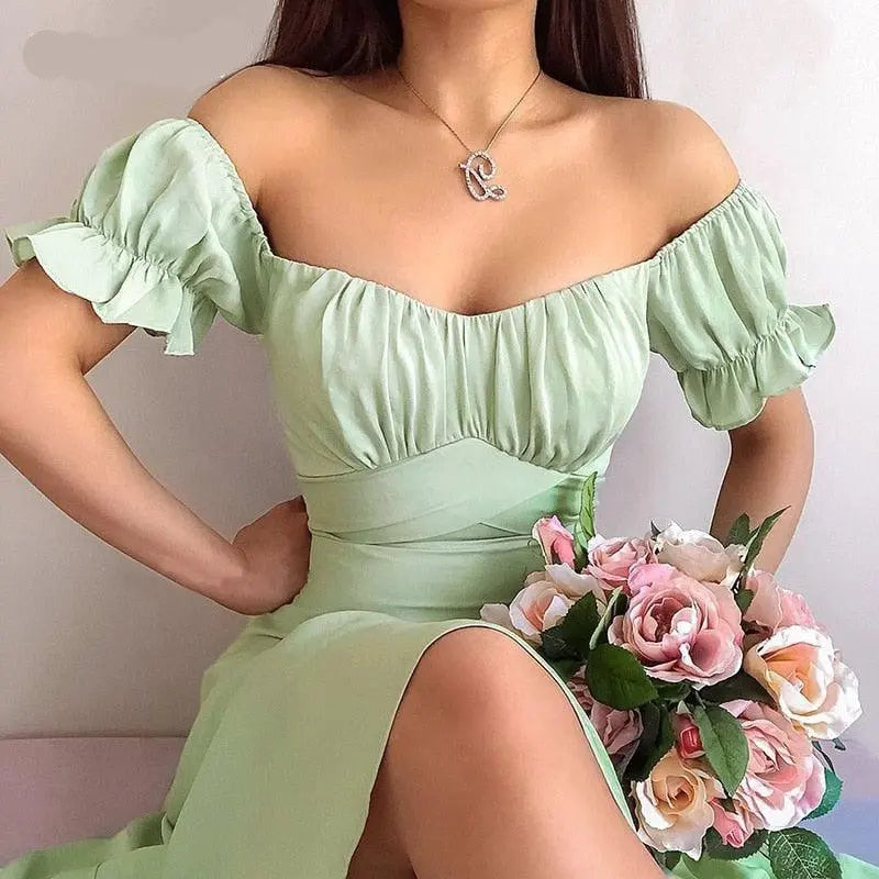 Novedad de verano, falda larga de manga corta con un solo hombro, Color puro, falda Sexy delgada, vestido Sexy a media pantorrilla