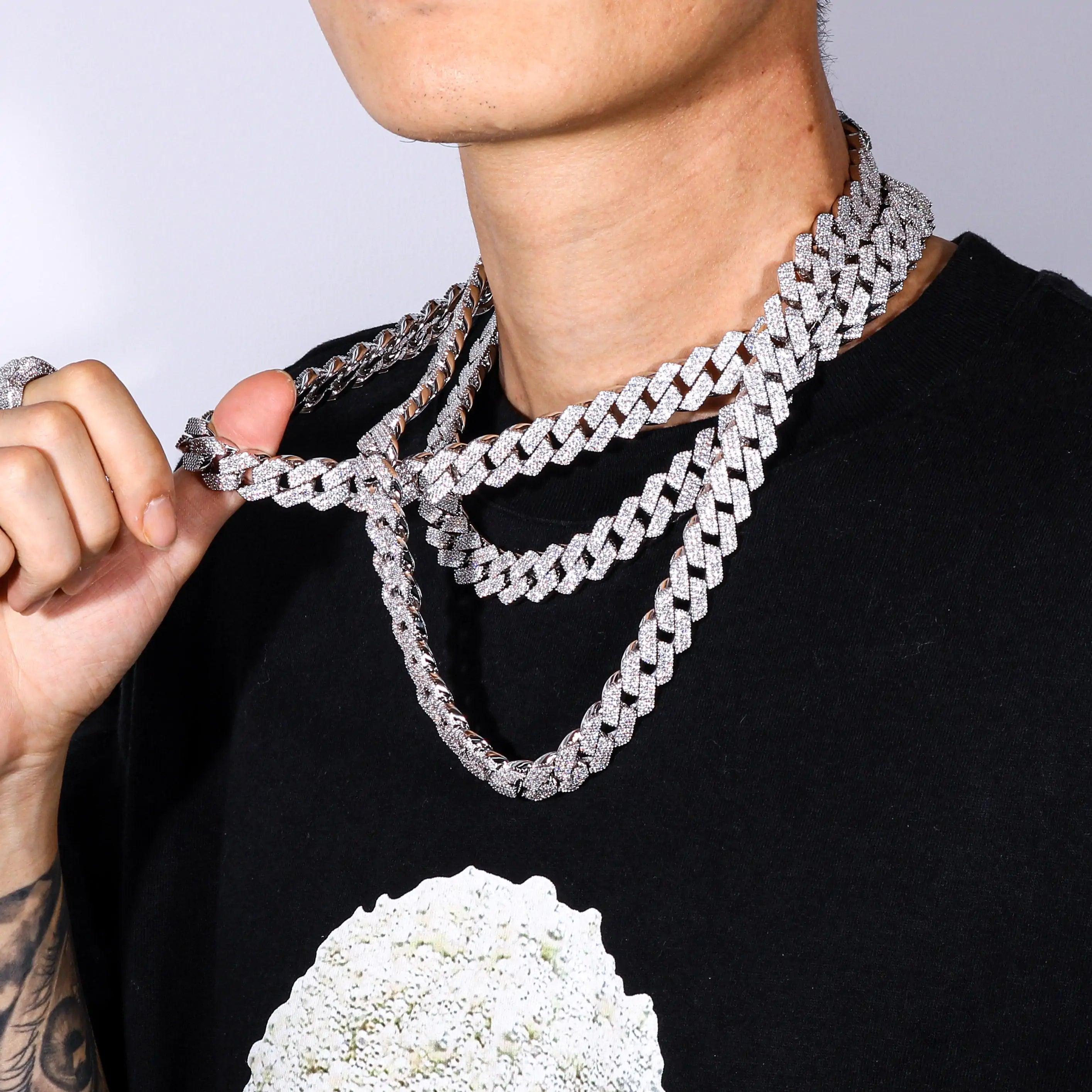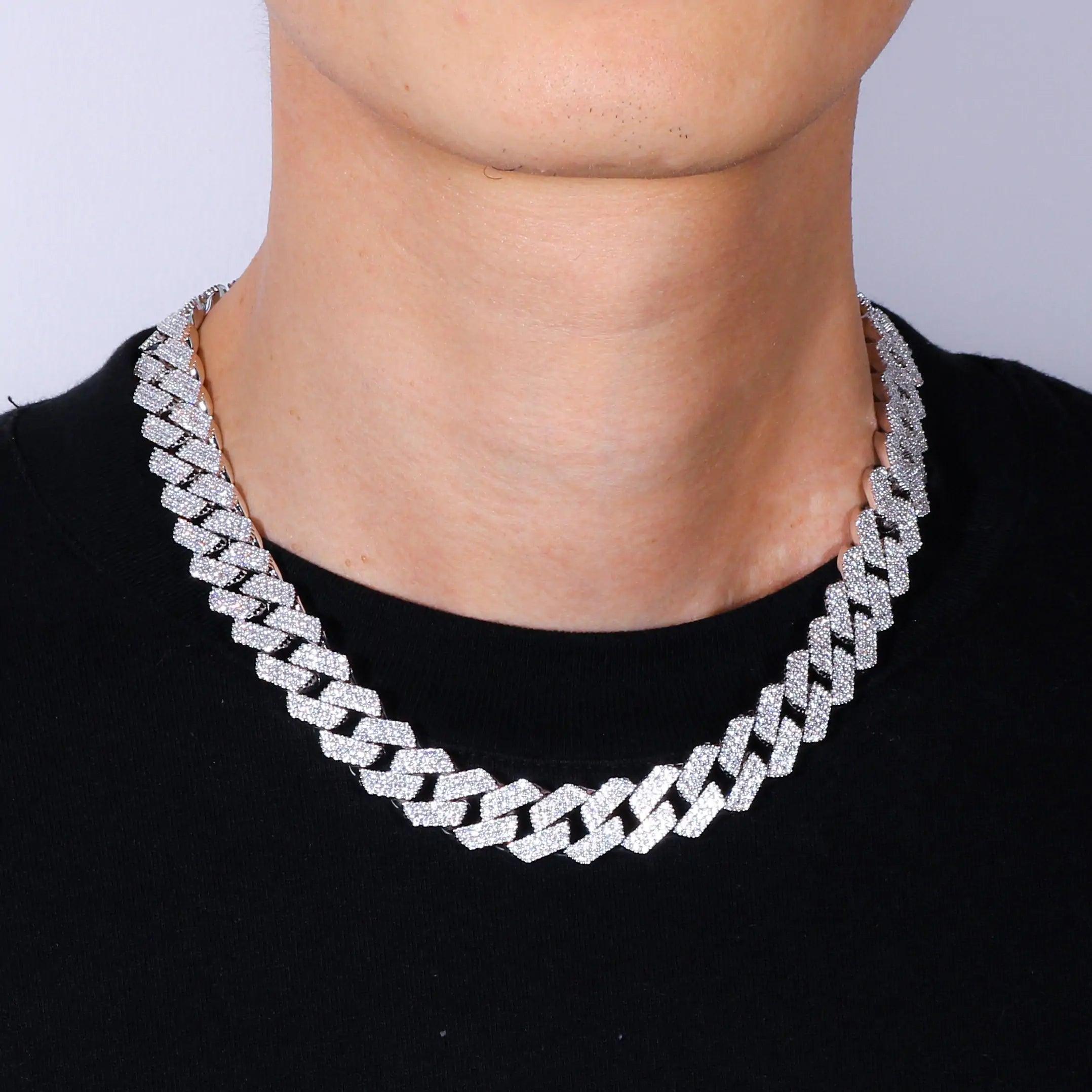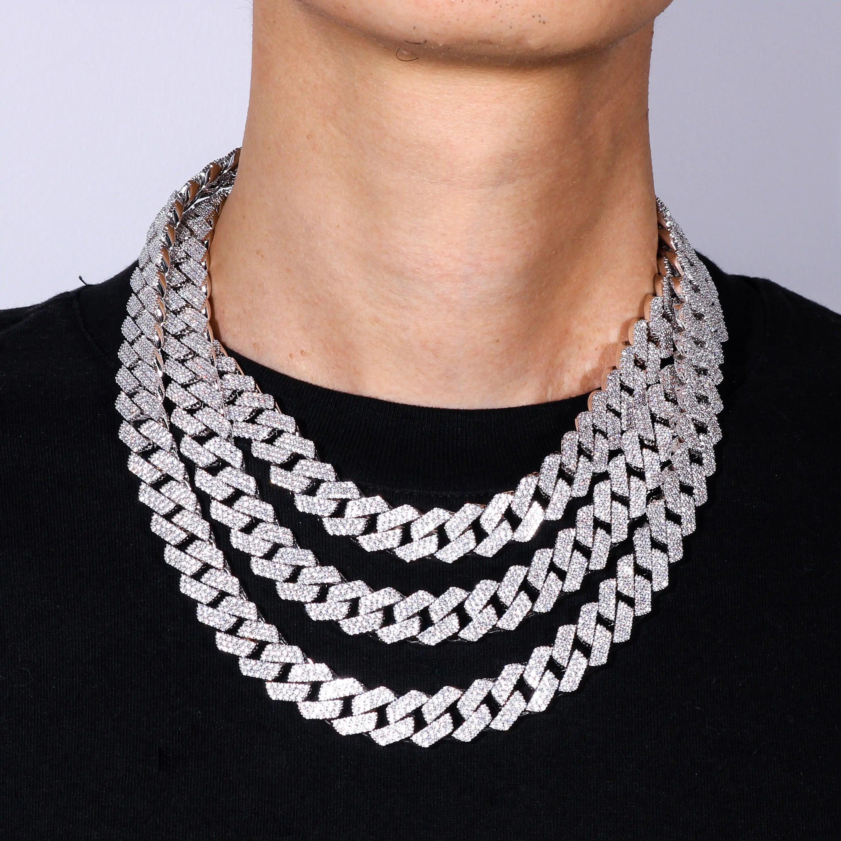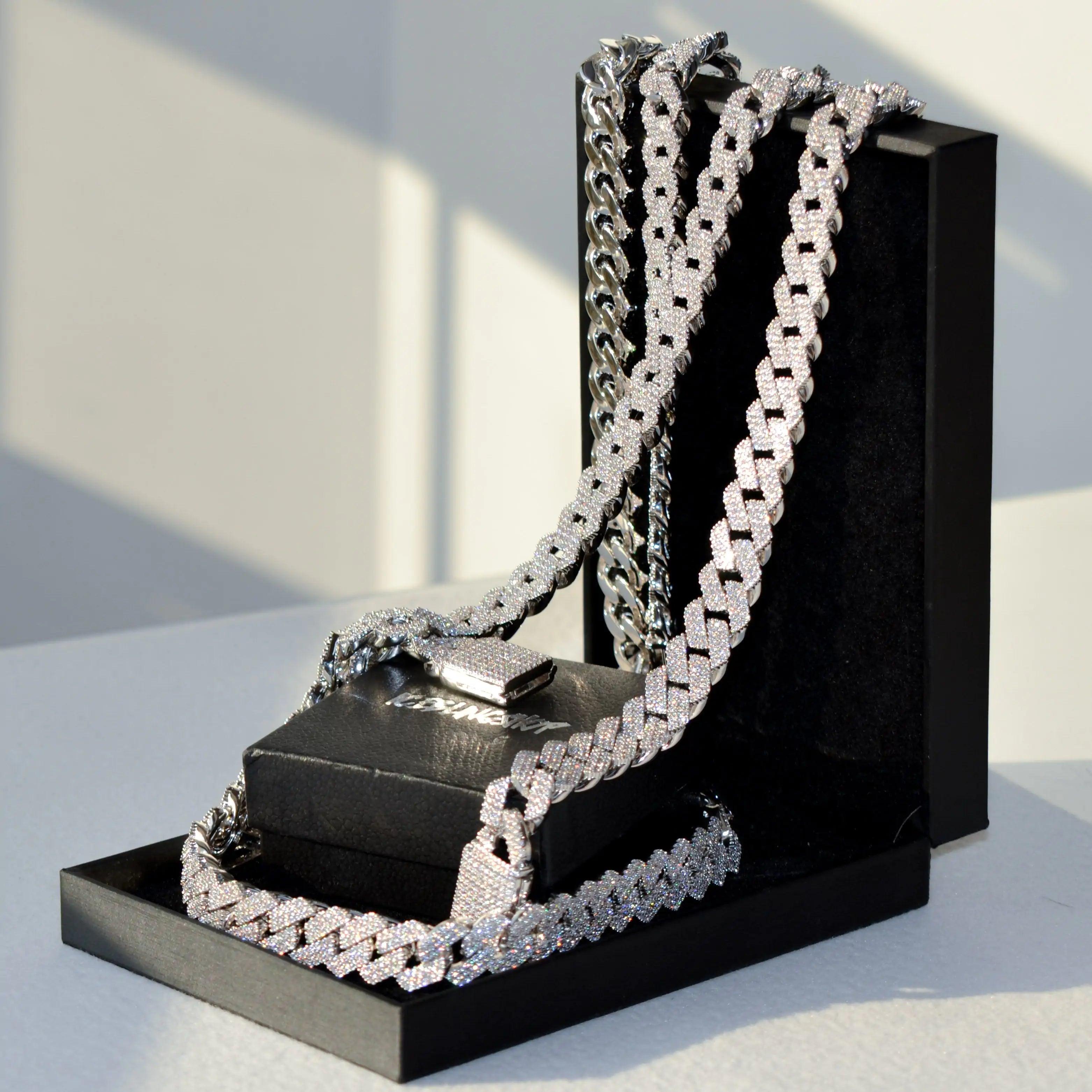 Cadena de eslabones cubanos con puntas de diamantes y tres hileras en oro blanco