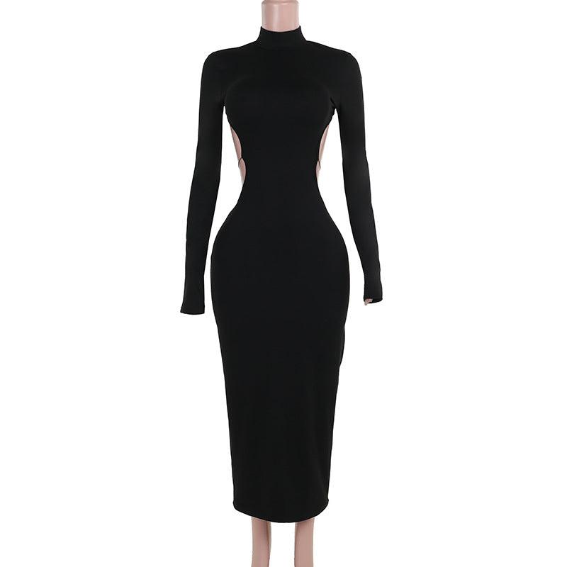 Vestido ajustado de mujer con escote alto, espalda descubierta y mariposa