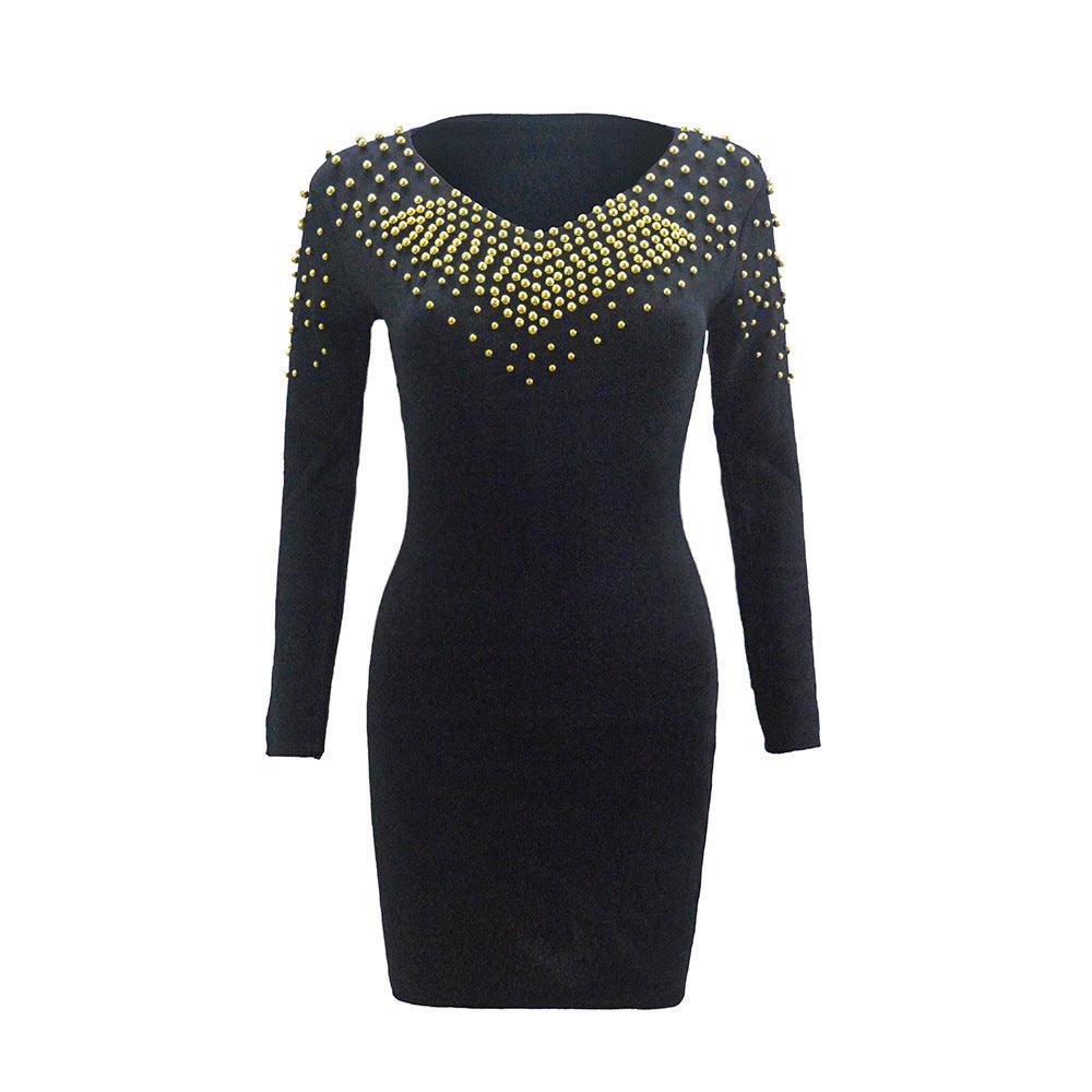 Vestido de punto con escote en V y manga larga con cuentas para mujer
