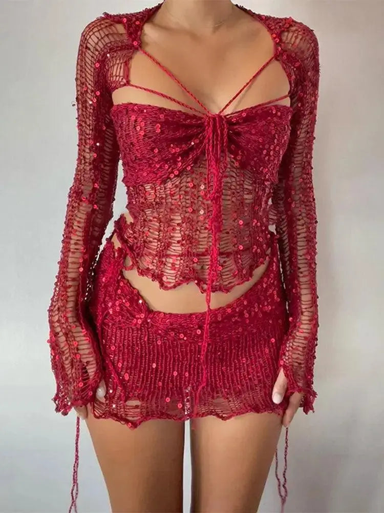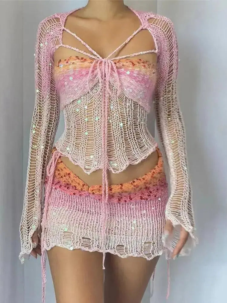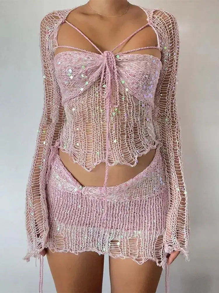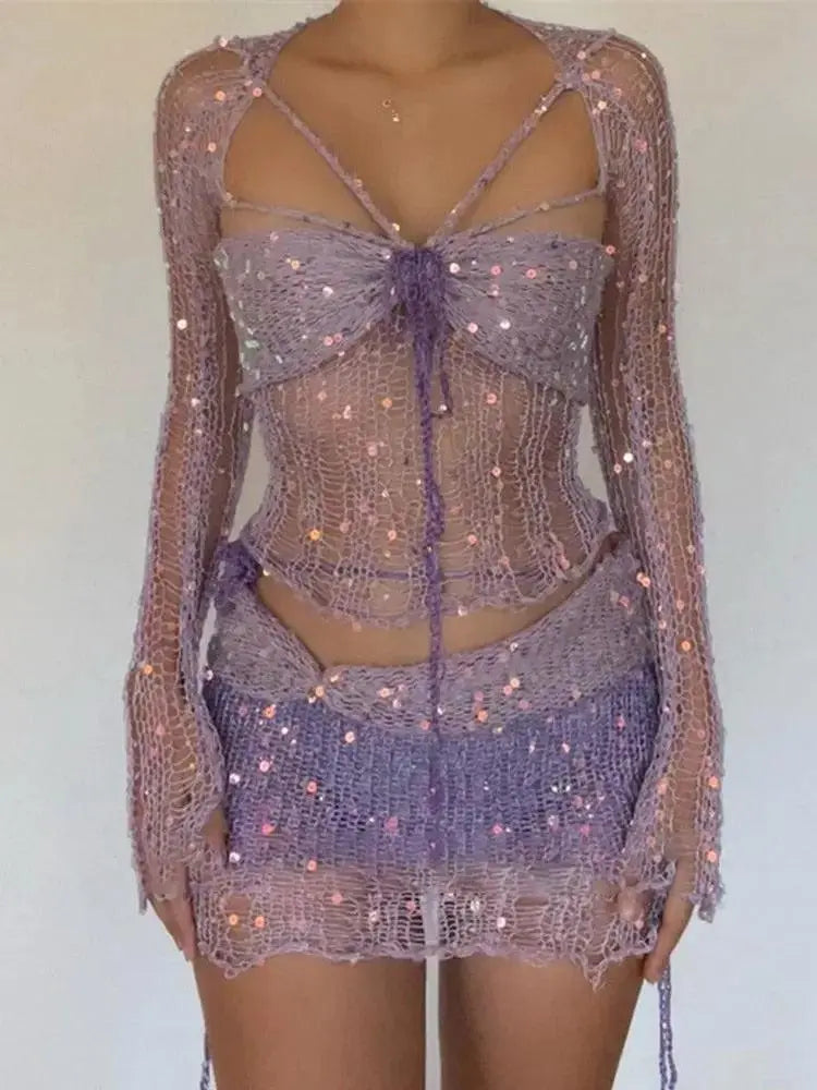 L'ensemble trois pièces à paillettes tricotées en détresse est le complément parfait à votre garde-robe pour tout festival ou occasion bohème. Cet ensemble comprend une bralette, un châle et votre choix d'une mini ou d'une jupe longue, le tout confectionné dans un tissu tricoté doux et confortable rehaussé de détails vieillis et de paillettes scintillantes.