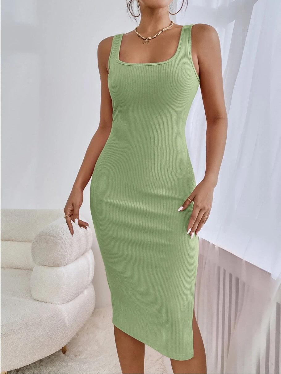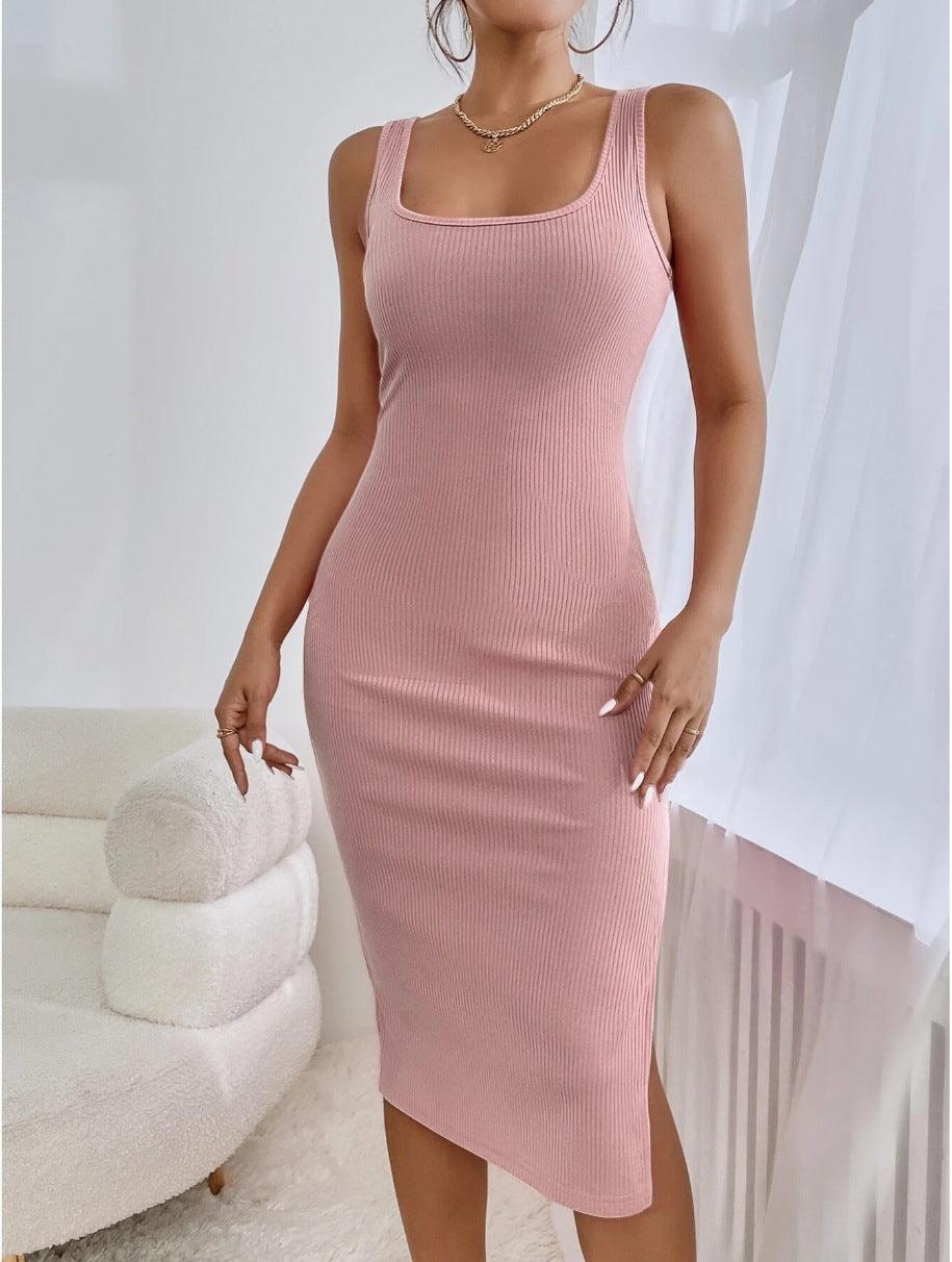 Robe fendue amincissante à col carré et sans manches à rayures côtelées élégantes