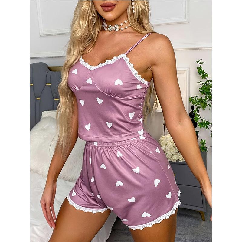 Ensemble deux pièces en dentelle et cœur imprimé en soie de lait pour femme, costume de loisirs pour la maison