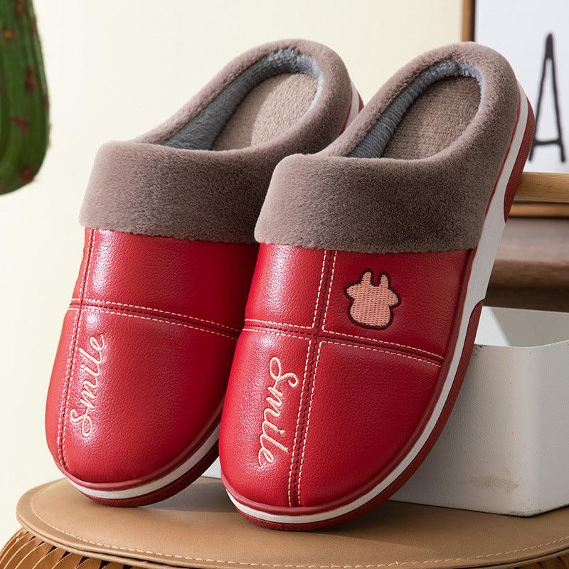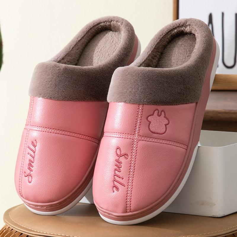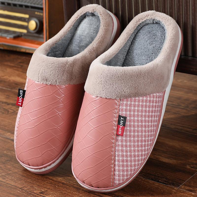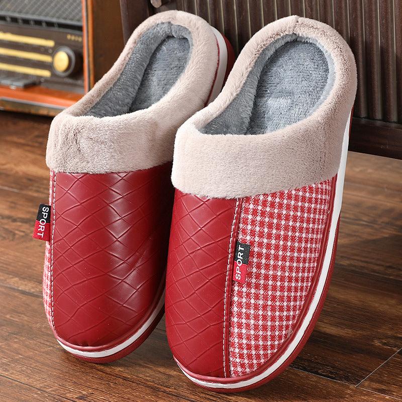 Nouveau cuir PU pantoufles de coton imperméables femme automne et hiver maison grande taille couple plus velours fond épais coton chaud glisser hommes en gros