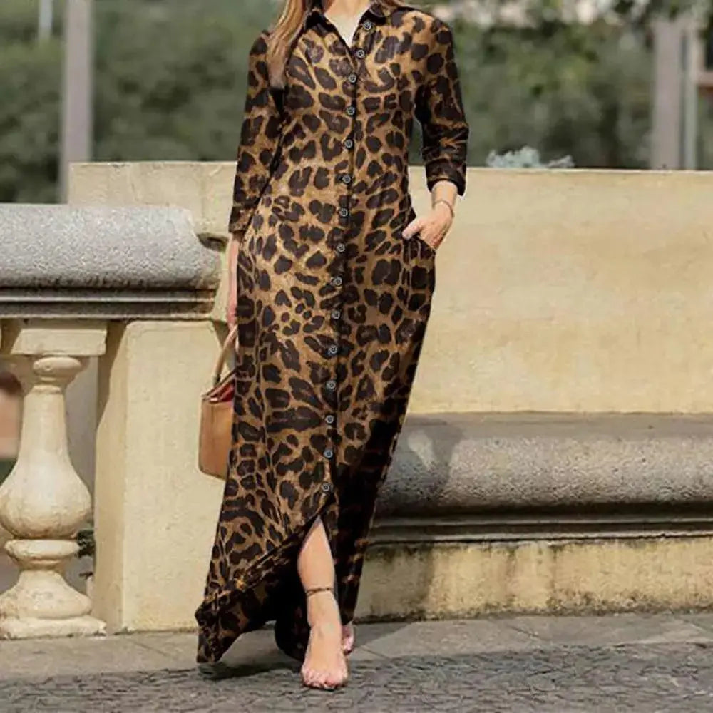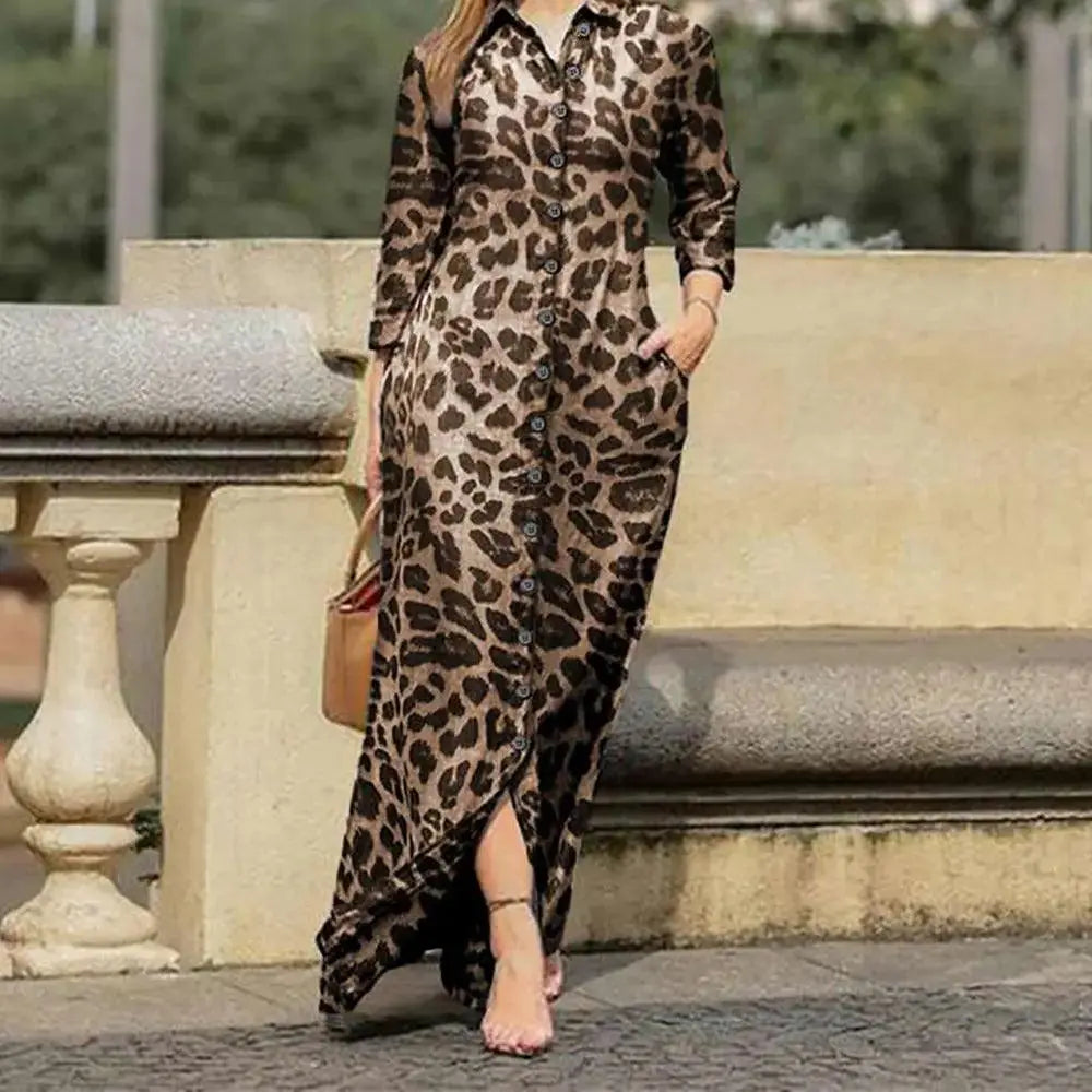 Robe longue chemise imprimée léopard à manches longues pour femmes populaires