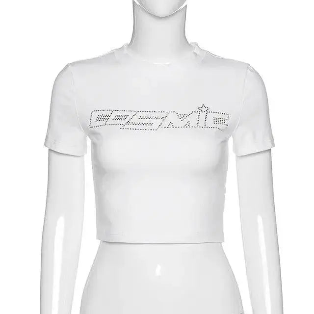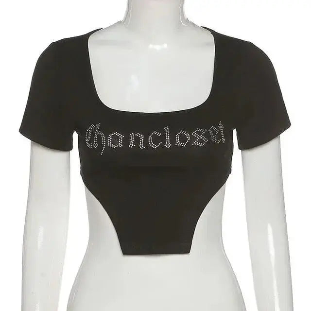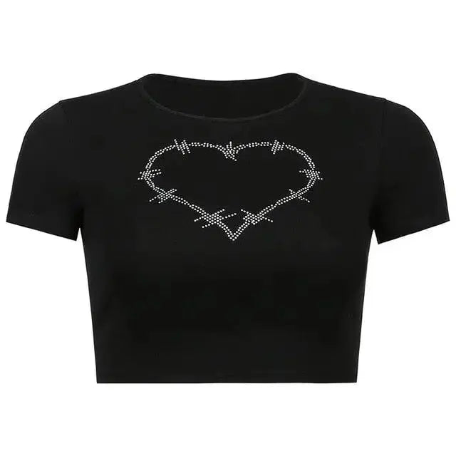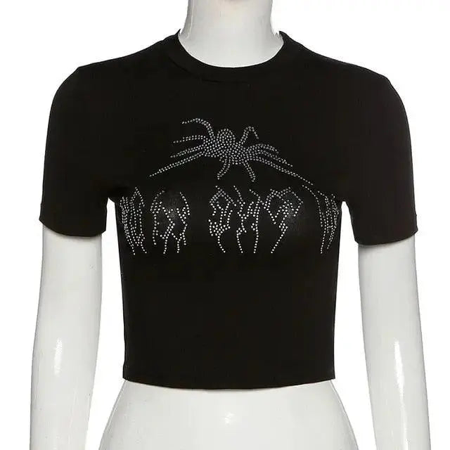 T-Shirts noirs à manches courtes et col rond, style Punk Vintage avec motif d'araignée en strass, centre commercial Goth Y2K, hauts courts esthétiques e-girl