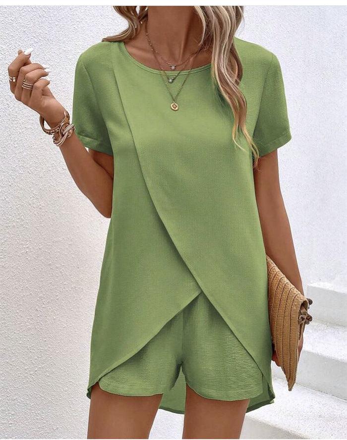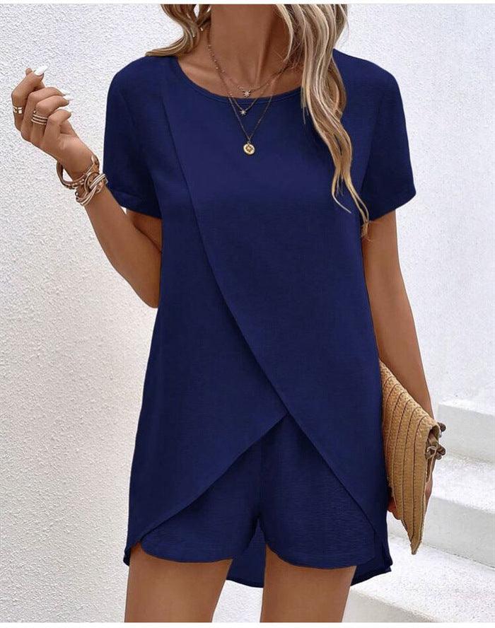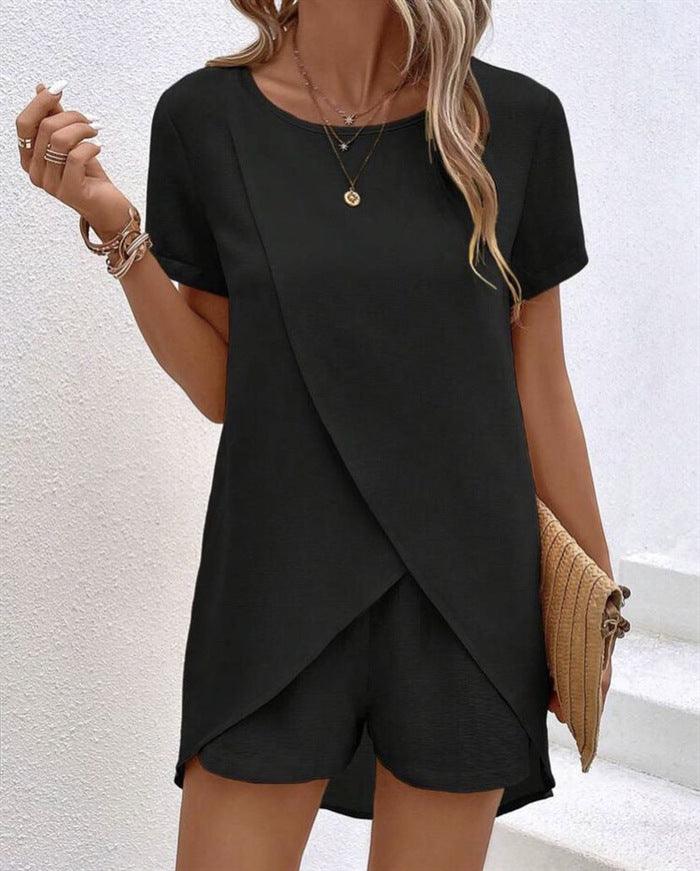 Costume pour femme de couleur unie, haut irrégulier et short