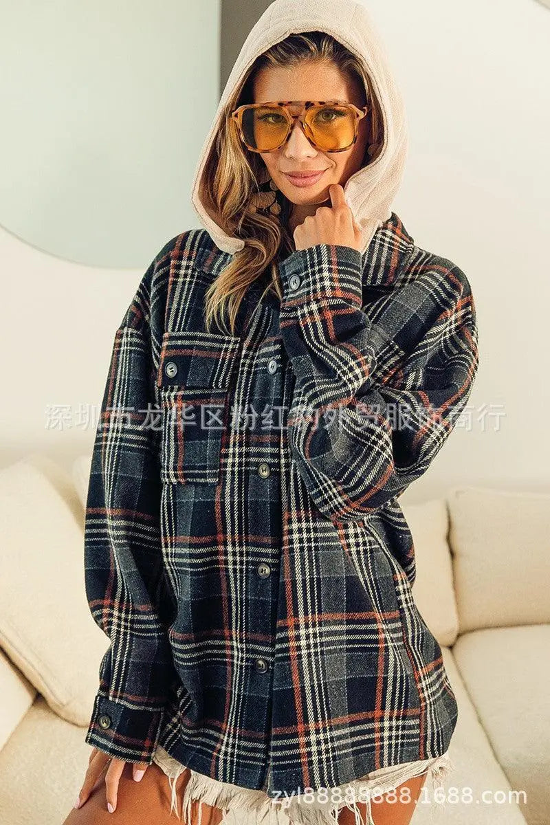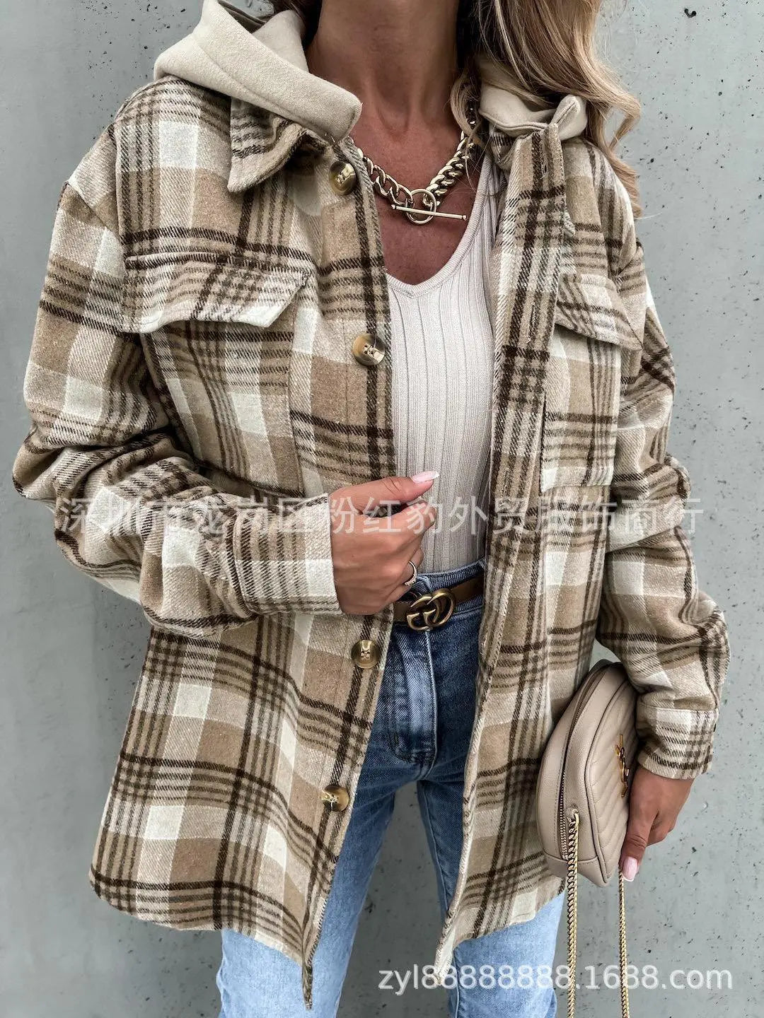 Women's Coat Fashion Hooded (Detachable) Woolen Plaid Coat