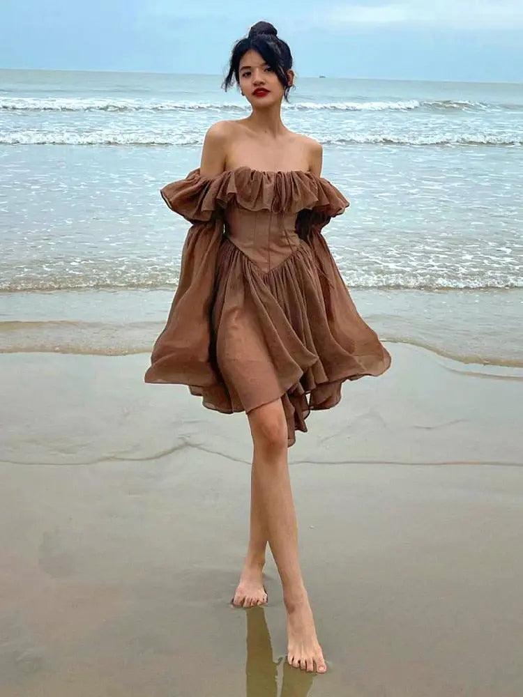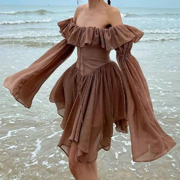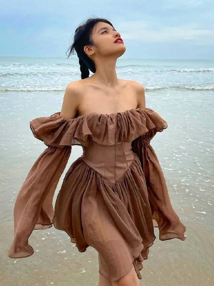 Brown Off Shoulder Flare Sleeve Mini Dress