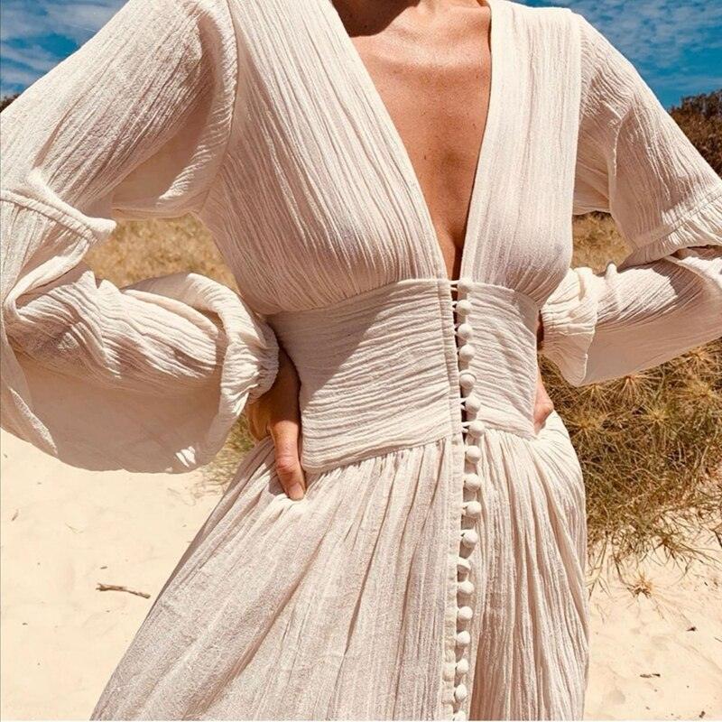 Chic Women Boho Beach Maxi Dress Button Up Deep V Neck Full Sleeve Long Dress Fairy Grunge French Romance Holiday Clothes