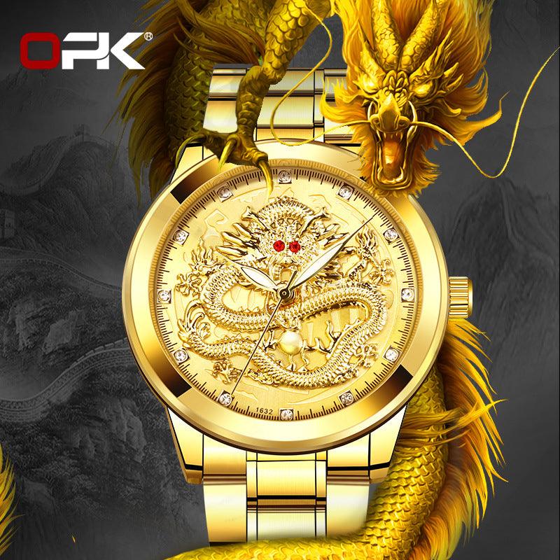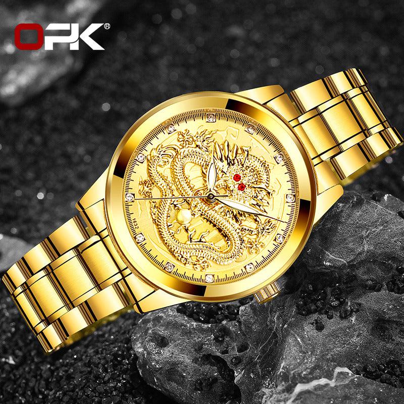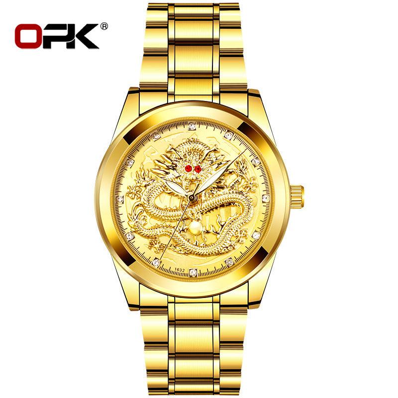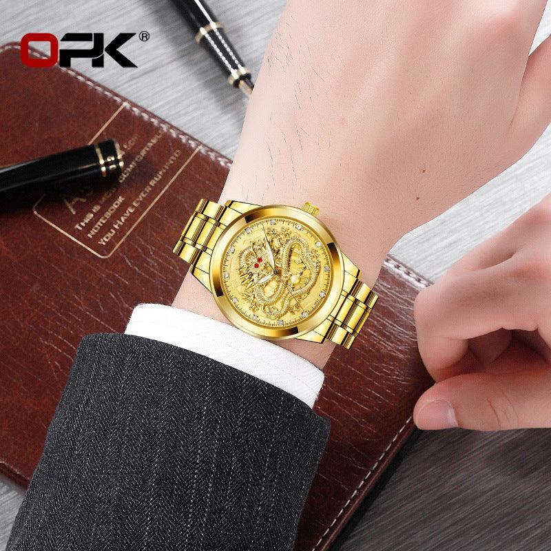 Cross-border Hot OPK brand factory watches wholesale embossed dragon formatys and English table Double calendar waterproof men watch men