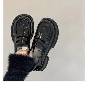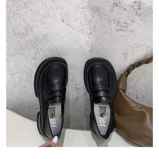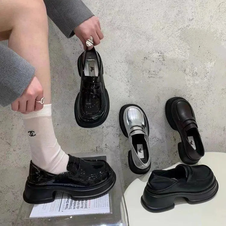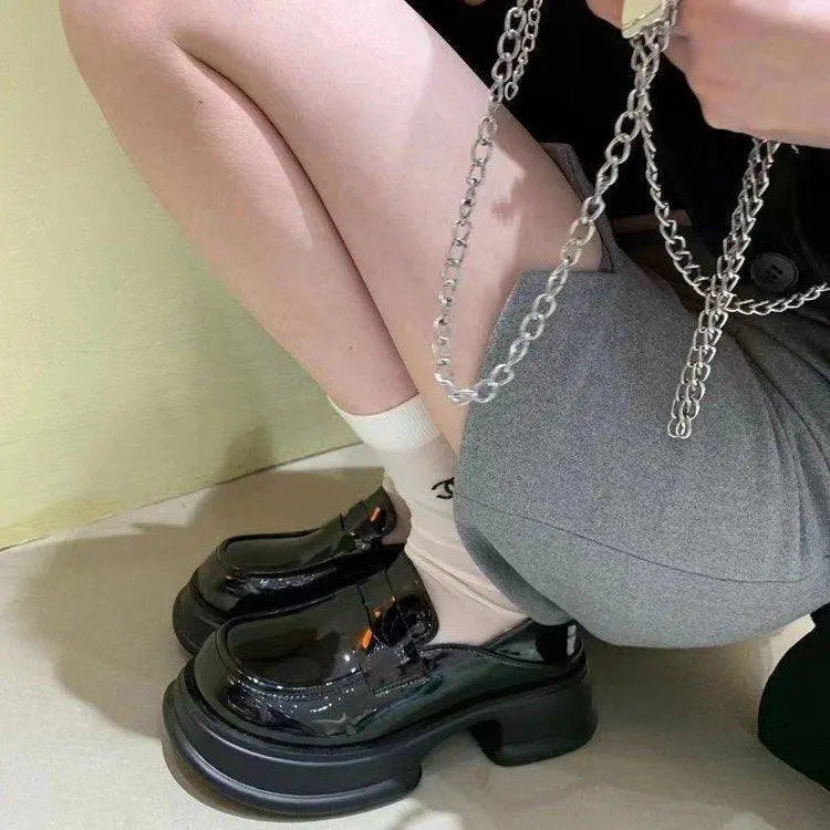 Design sense niche one-step thick-soled sponge cake square-toe small leather shoes female British style black small height increase single shoes