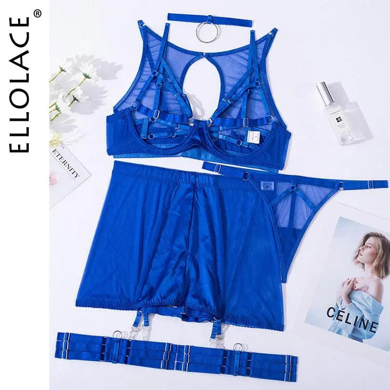 Ellolace Red Lingerie 5-Pieces Fancy Underwear Sexy Women Uncensored Transparent Bra Garters Briefs Sets Bandage Sex Outfits