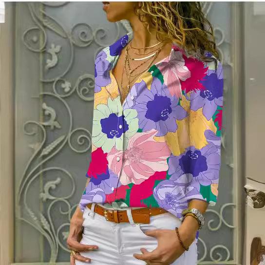 European And American Digital Printed Flowers Lapel Single Breasted Long-sleeved Shirt