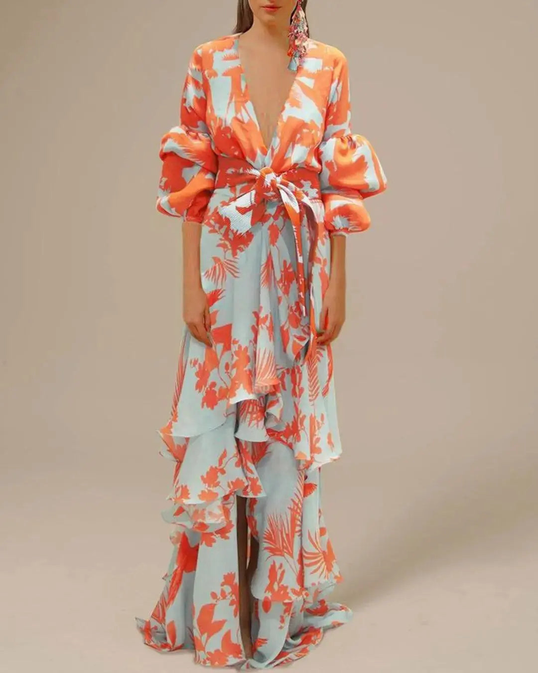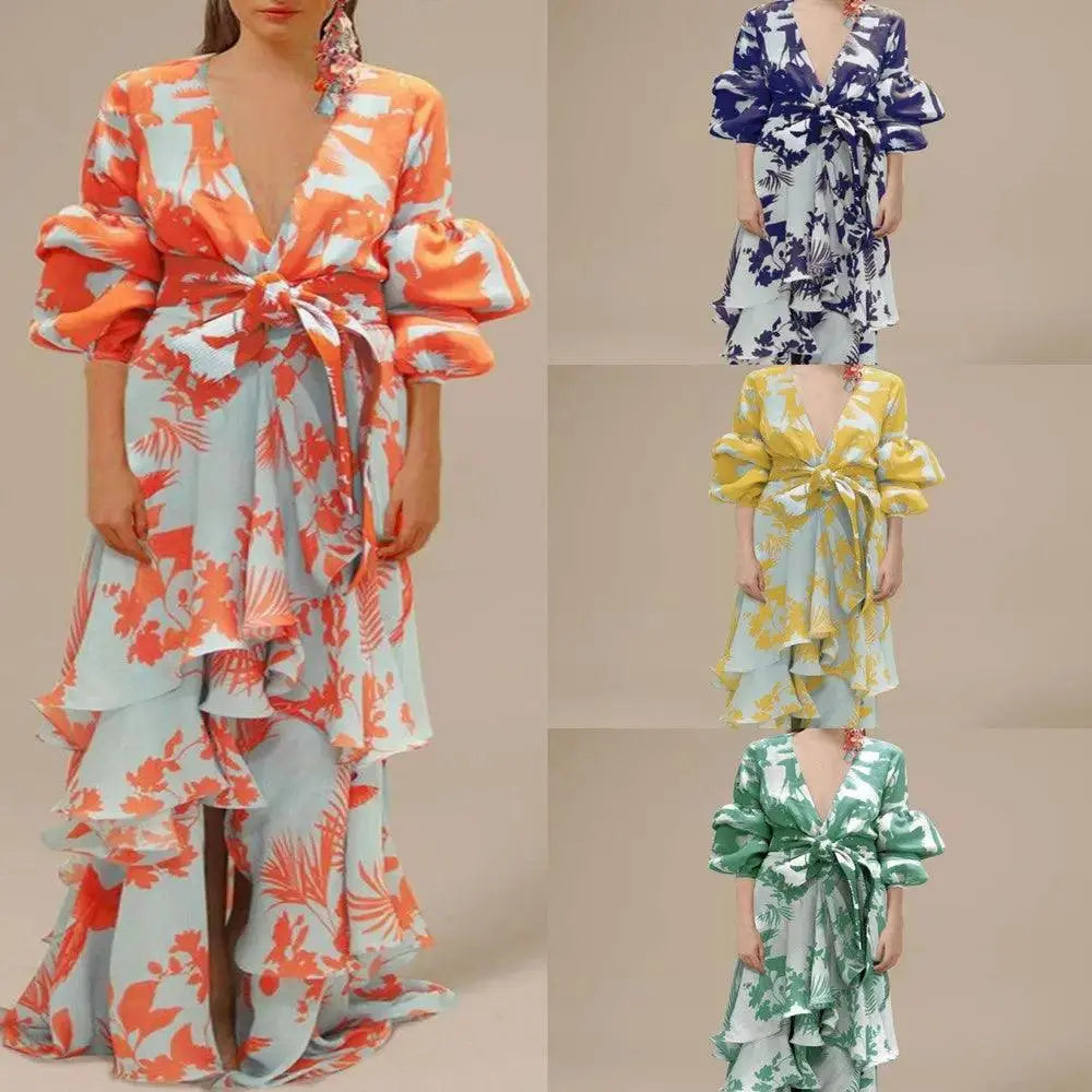 Product information: Fabric name: polyester fiberPattern: PrintSkirt length: long skirtSkirt type: large swing typeCollar: V-neckSleeve Length: Long SleeveWaist type: high... Read more