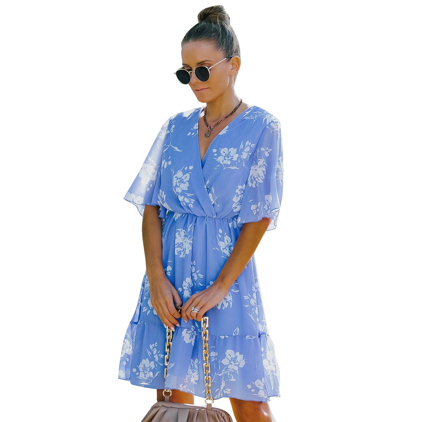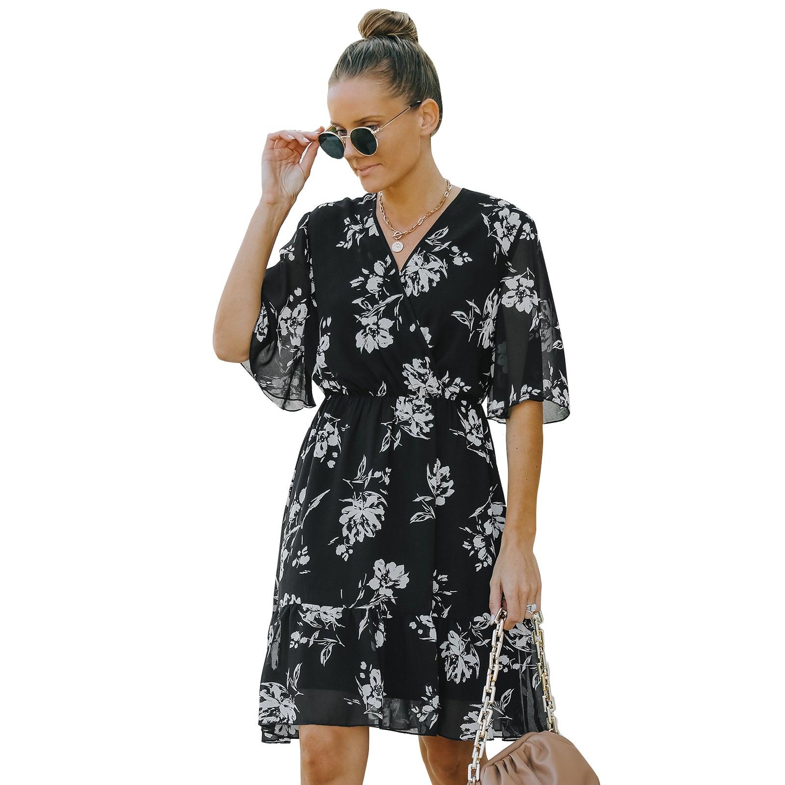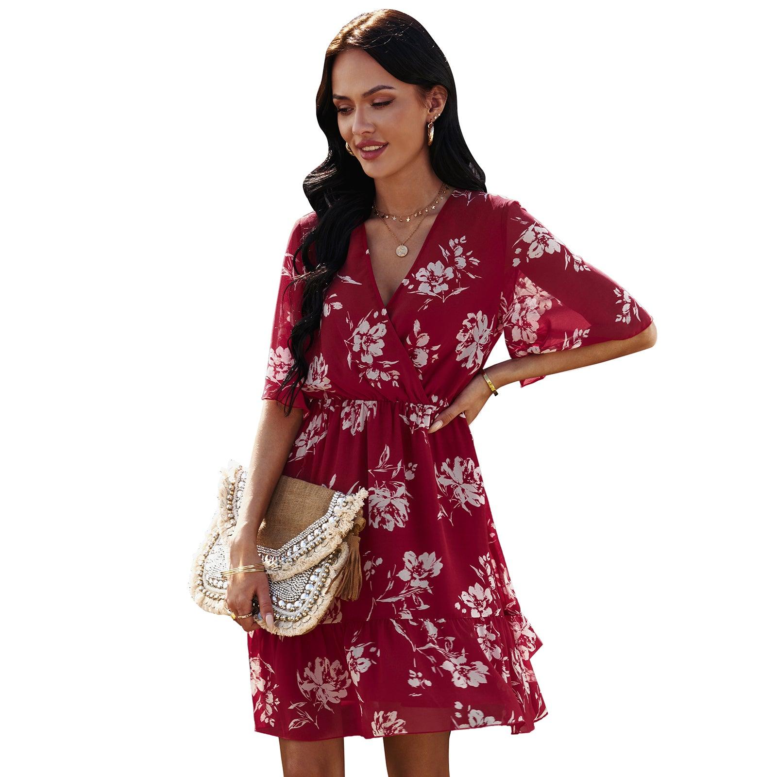 European And American Women's V-neck Ruffled Floral Chiffon Dress