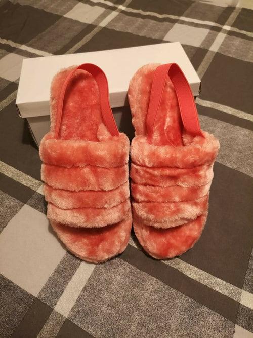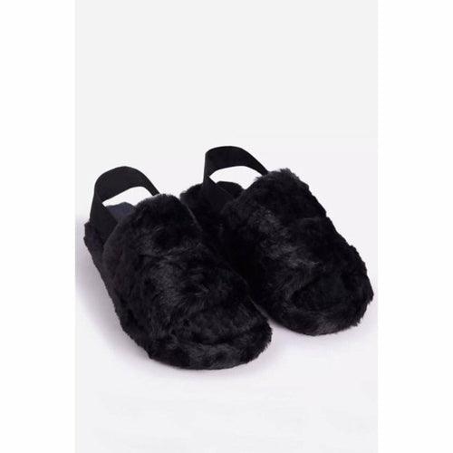 Faux Fur Fluffy Stripe Furry Slippers with Heel Strap.
