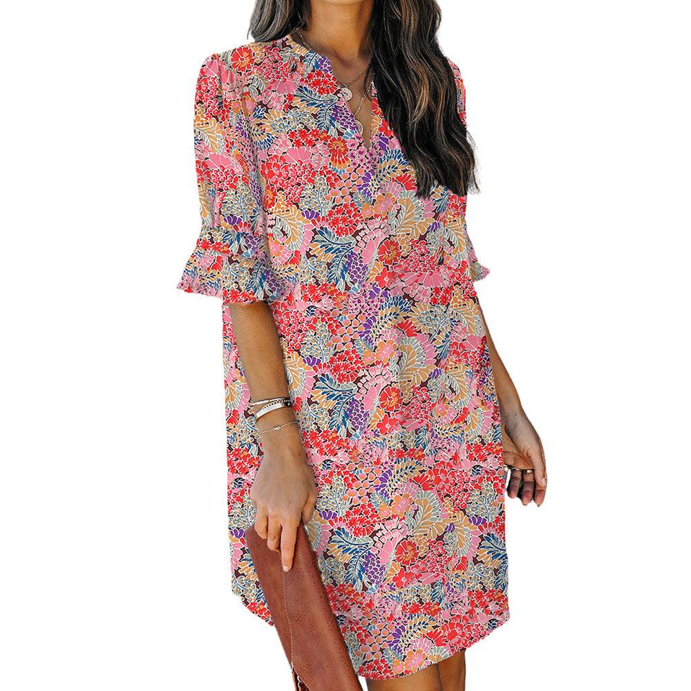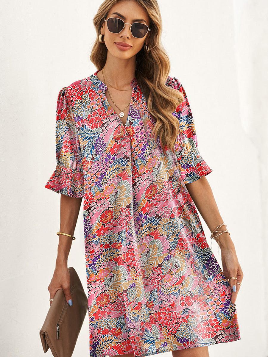 Floral bohemian floral print ruffled sleeve dress women's Amazon women's half-sleeved loose long skirt woman