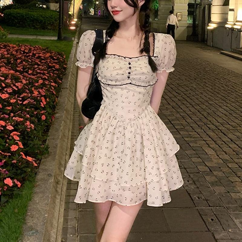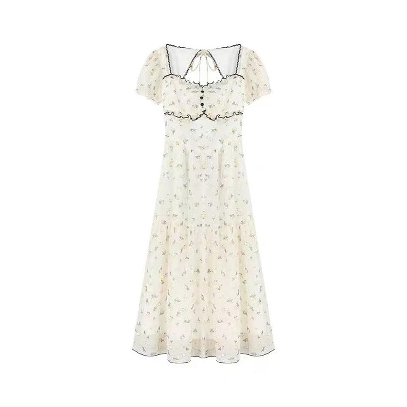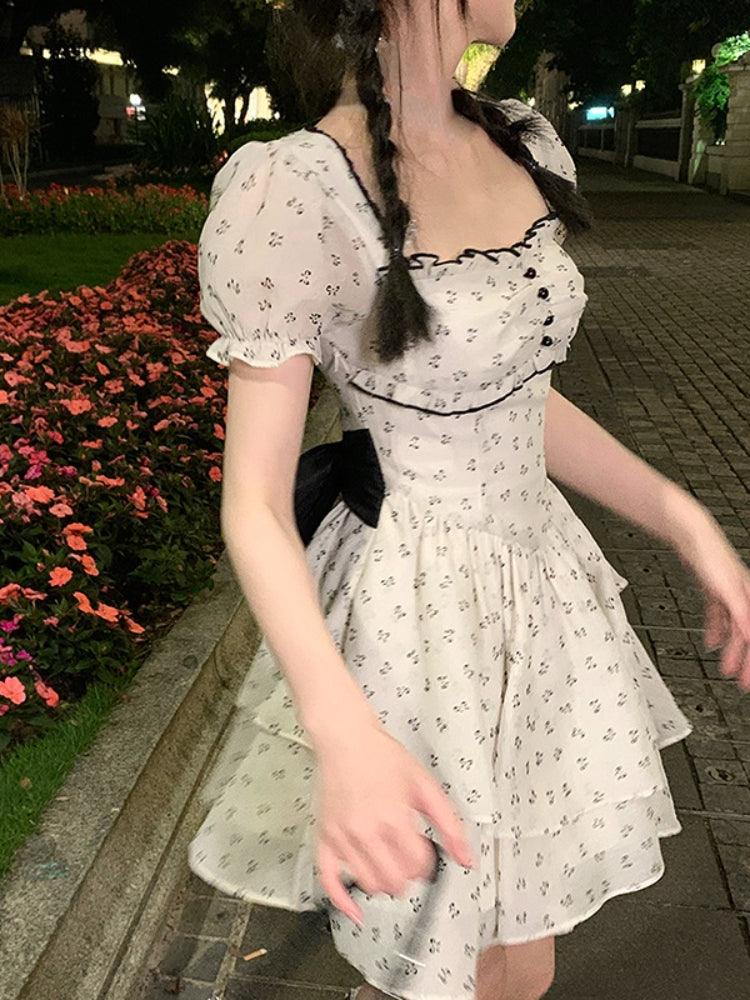 Floral White/Black Bow Decor Puff Sleeve Dress