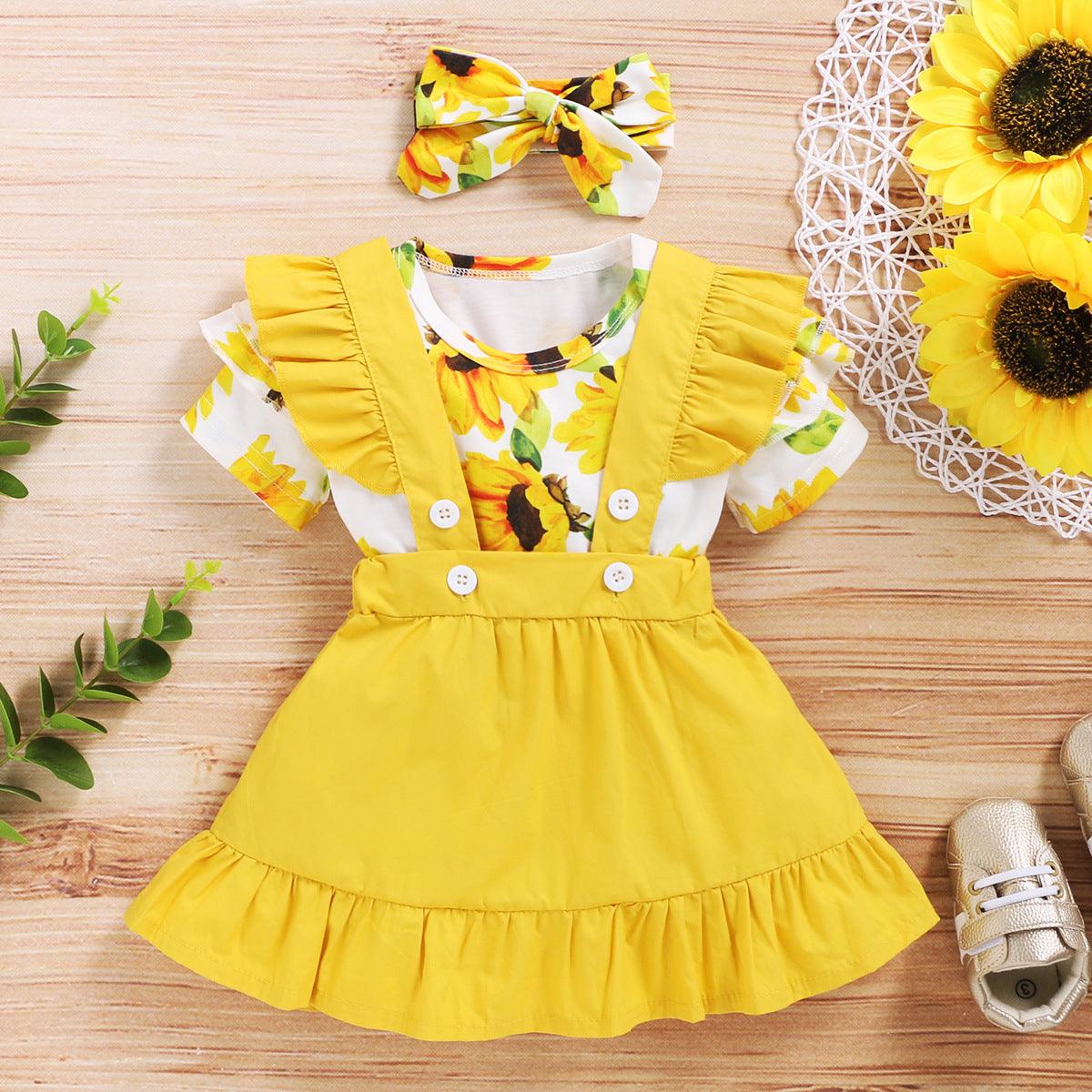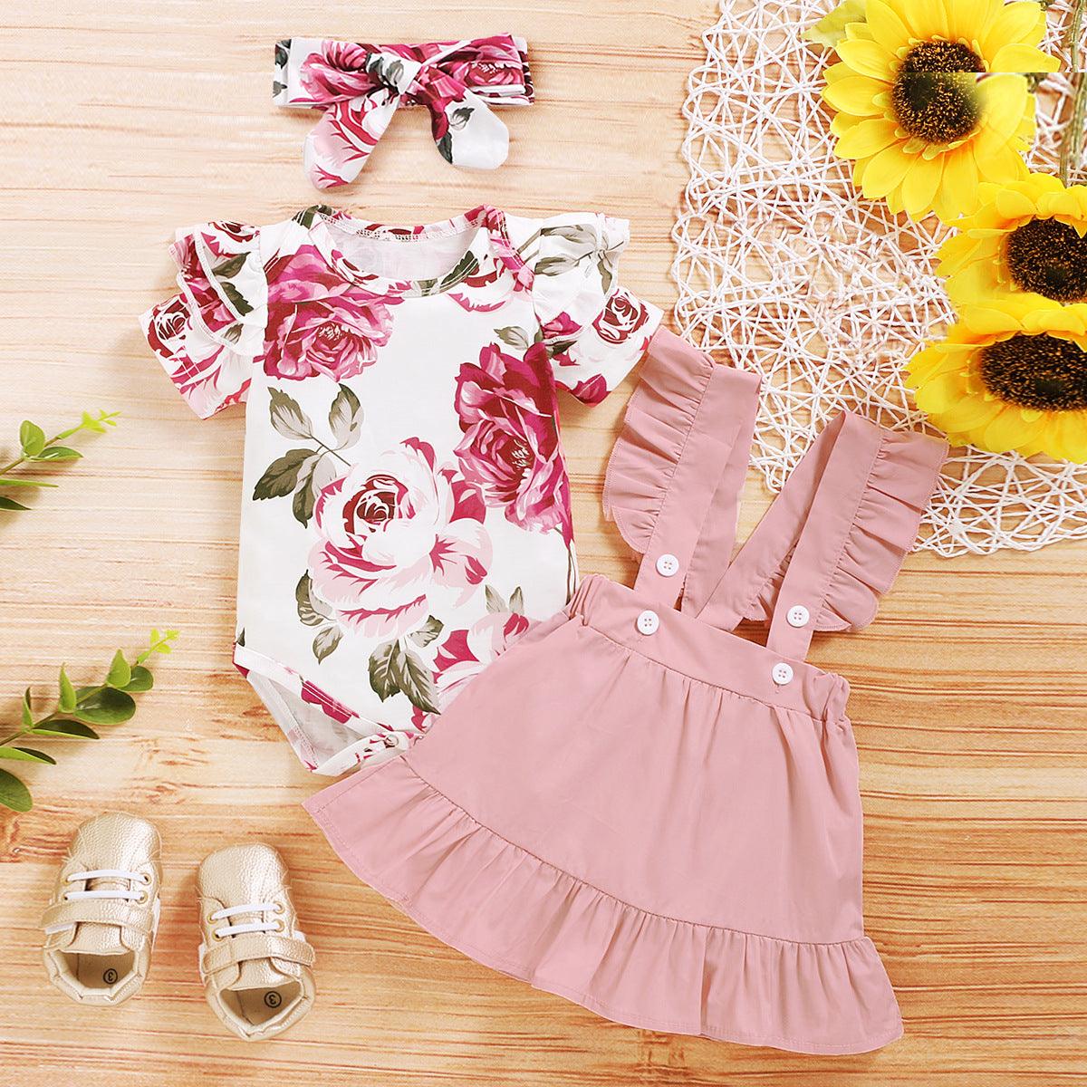 Girls spring and autumn skirt 2020 European and American new short-sleeved floral blouse + lace suspender skirt three-piece set