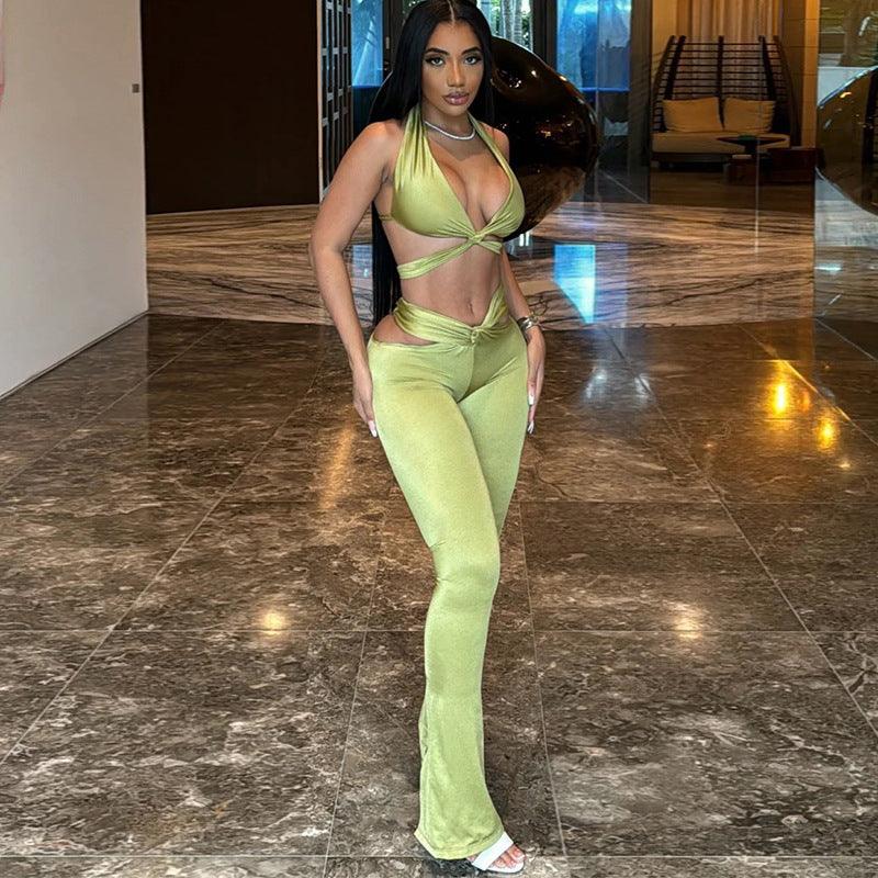 Hollow Sleeveless Halter Exposed Navel Blouse And Pants