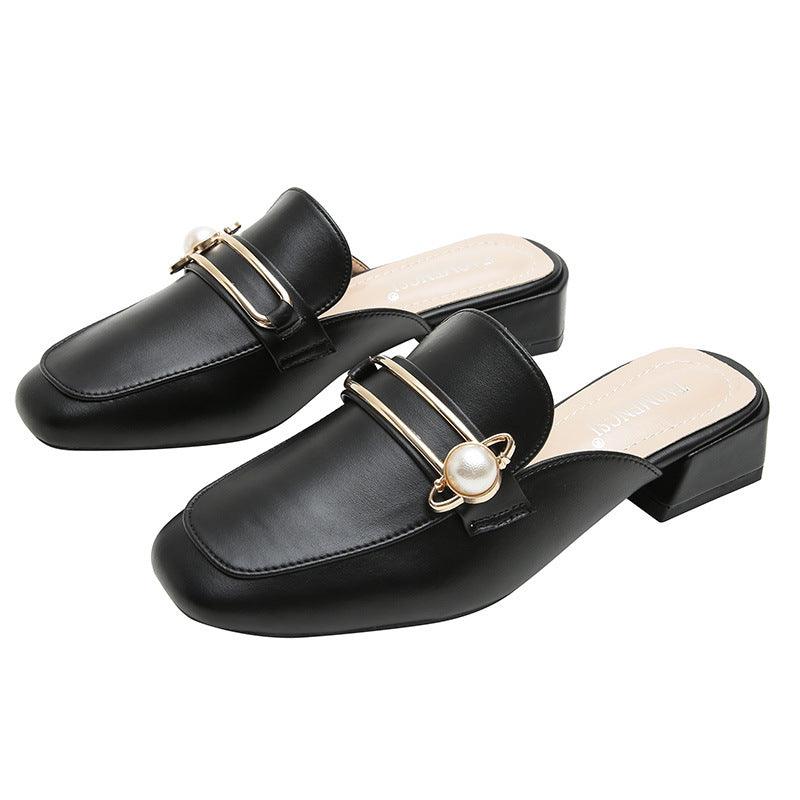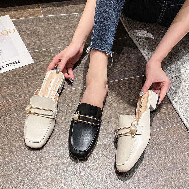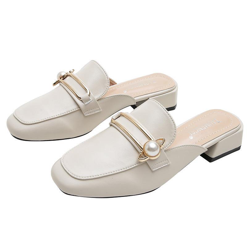 Japanese slippers female 2021 new bag head sandals female pearl lazy flat shoes outside wear thick with half slippers