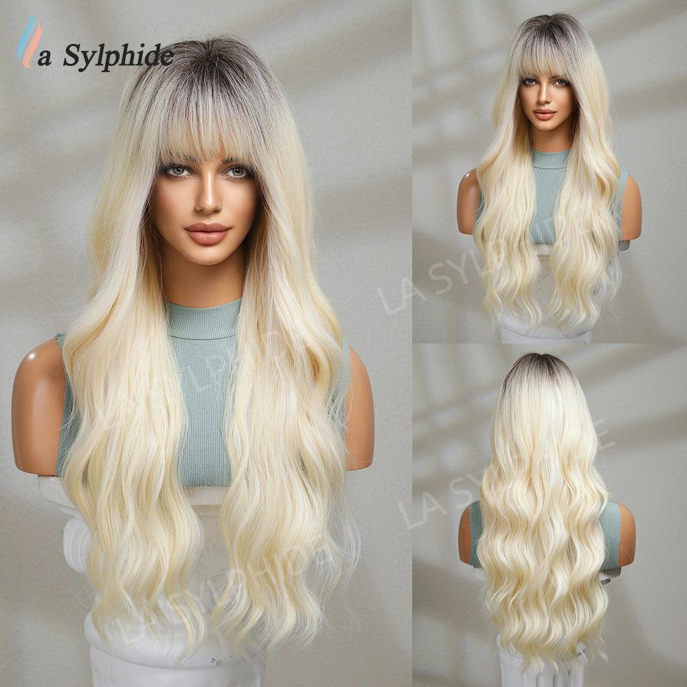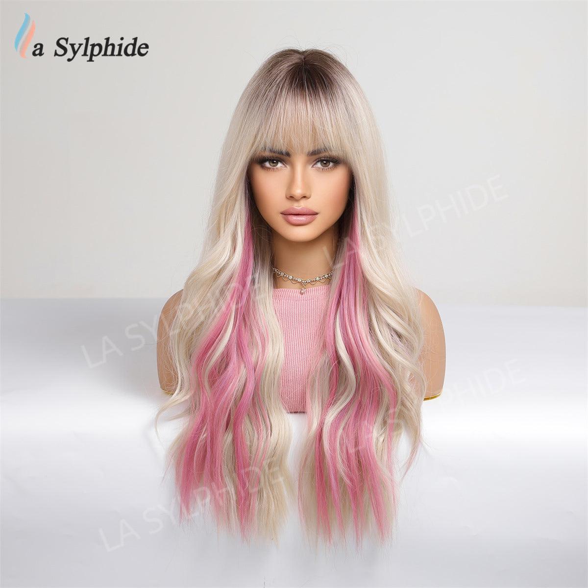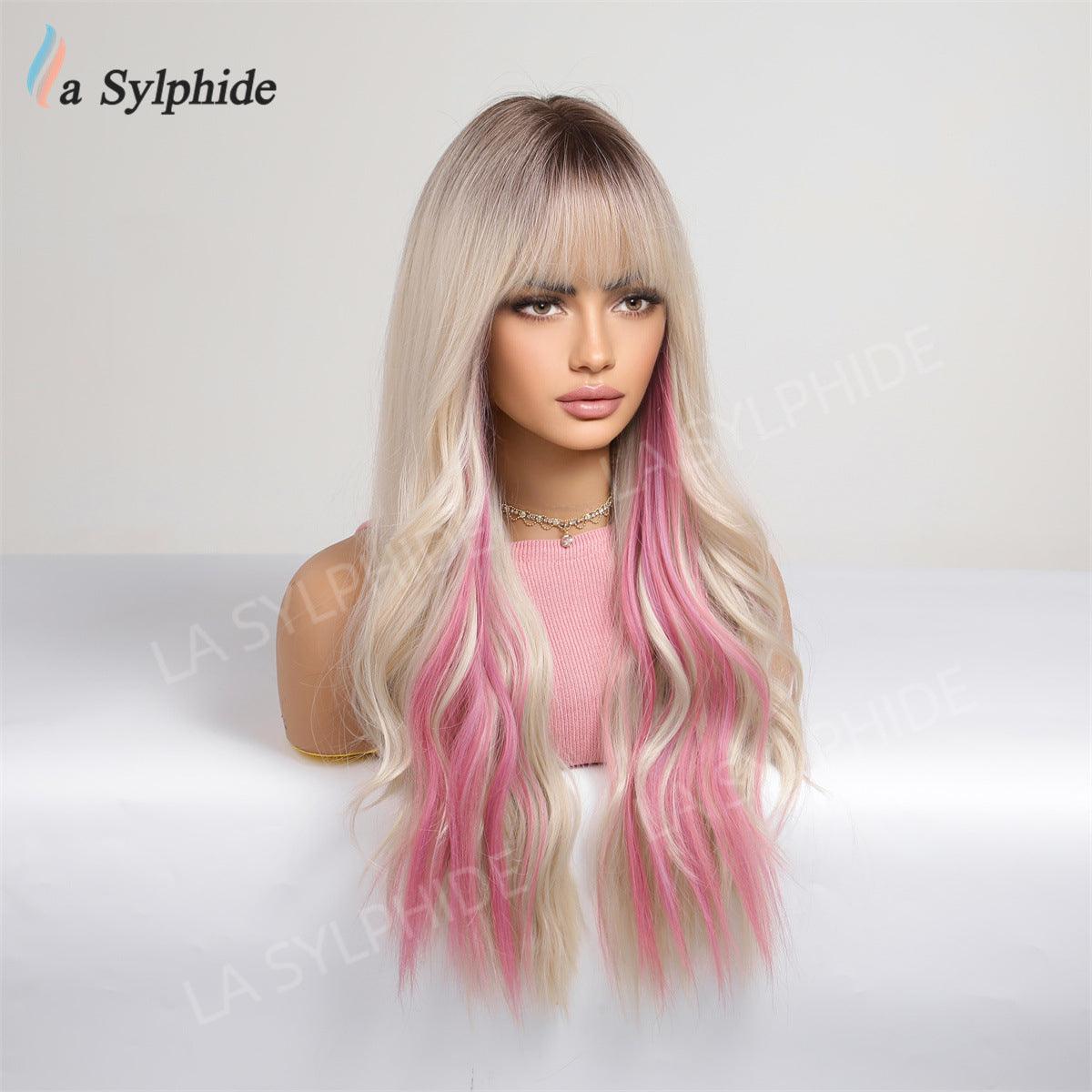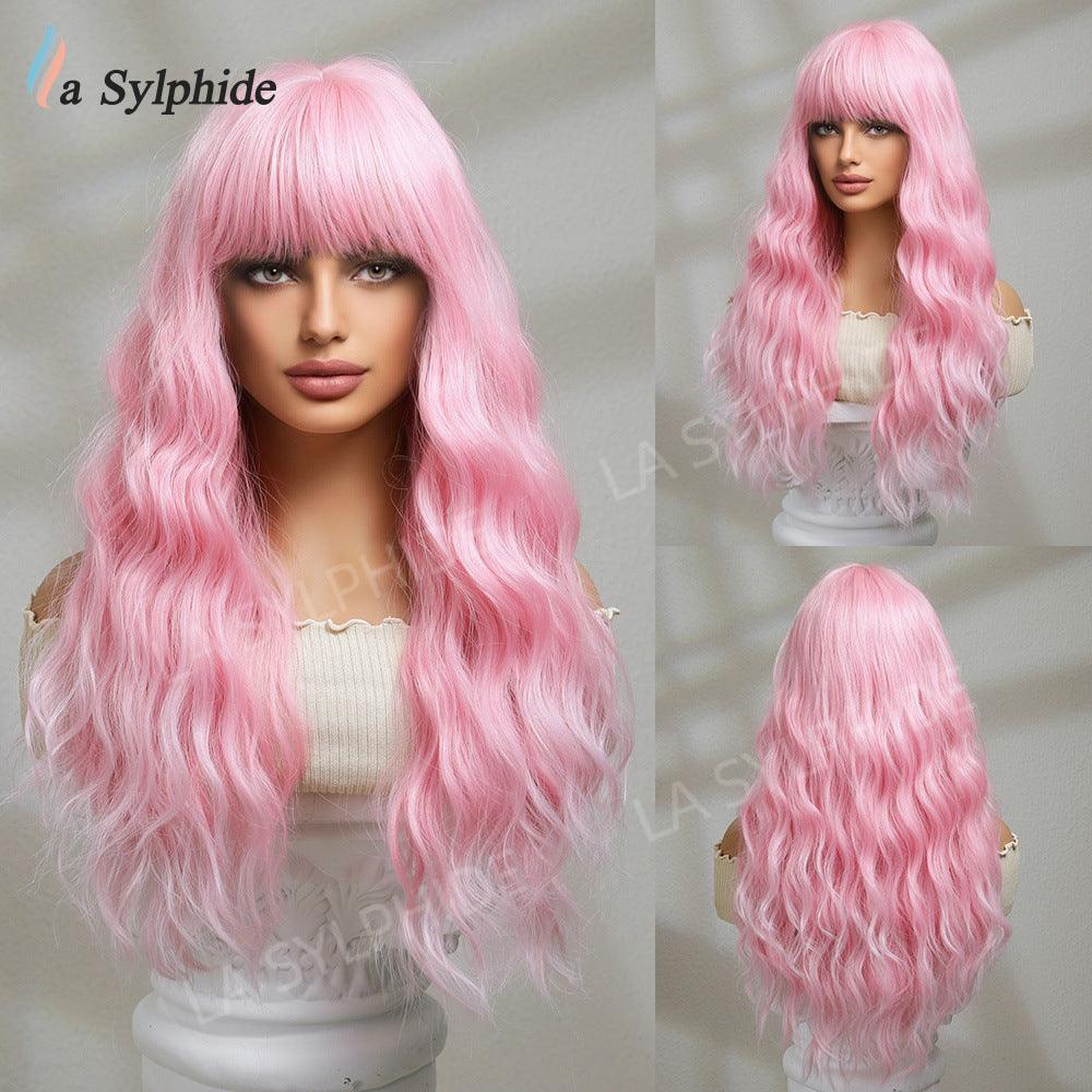 Long Curly Hair Wig Women's bangs Pink Platinum Rose Net Full Headset Long wig