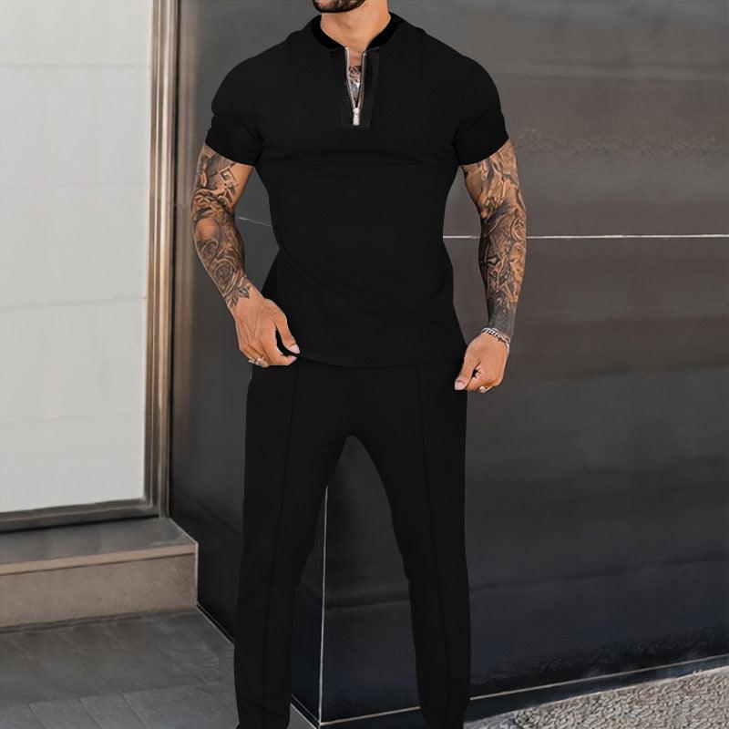 Men's Fashion Waffle Short Sleeve Stitching Stand Collar Suit