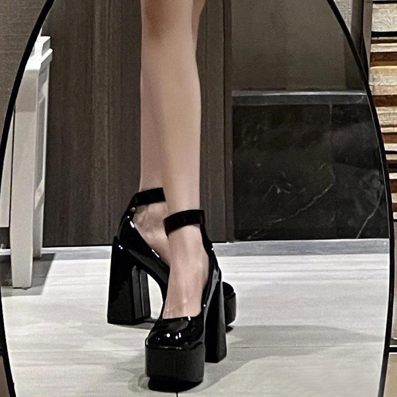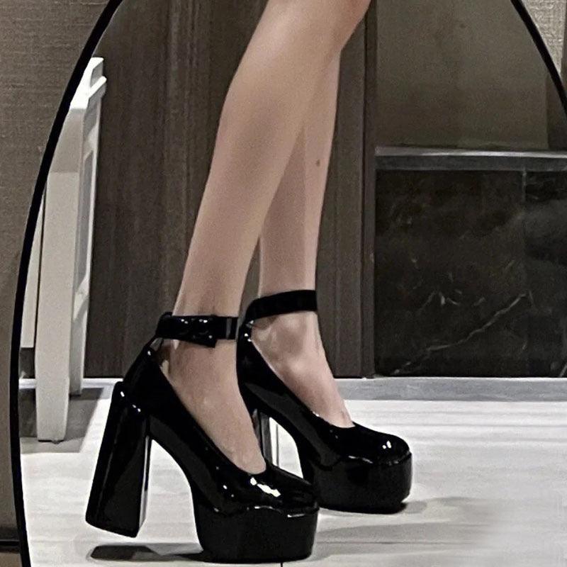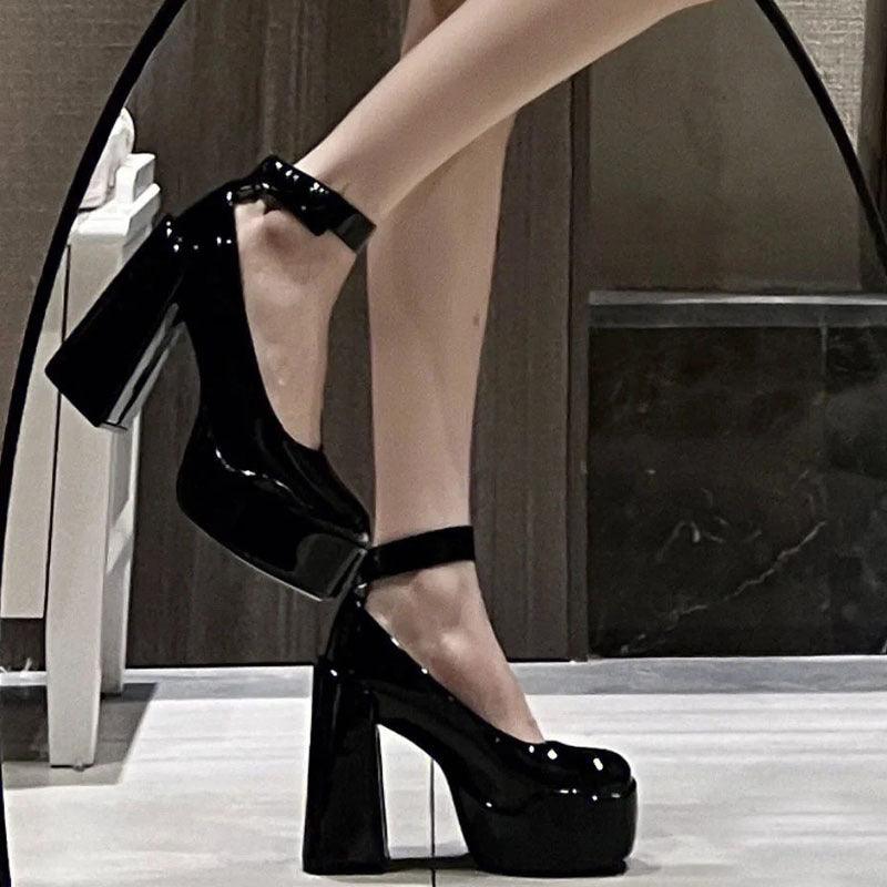 Patent leather round toe super high heel chunky one word buckle single shoes women 2023 spring and autumn European and American waterproof platform shallow mouth Mary Jane shoes