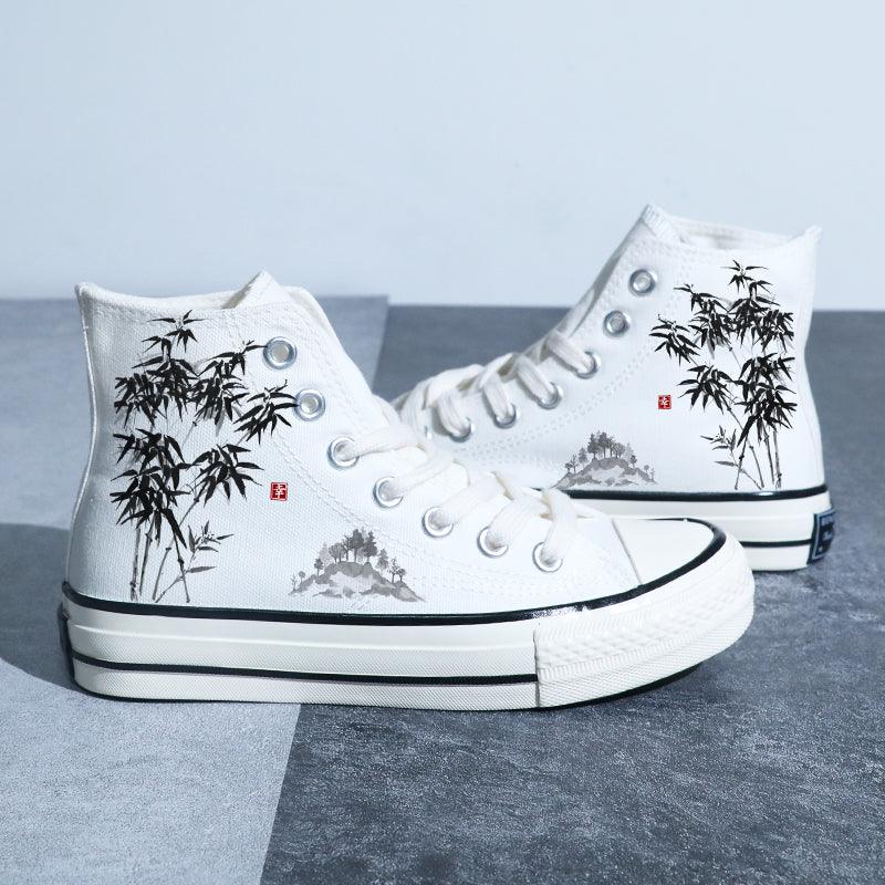 Retro Landscape Painting Lotus Pond Bamboo Canvas Shoes Stylish Design