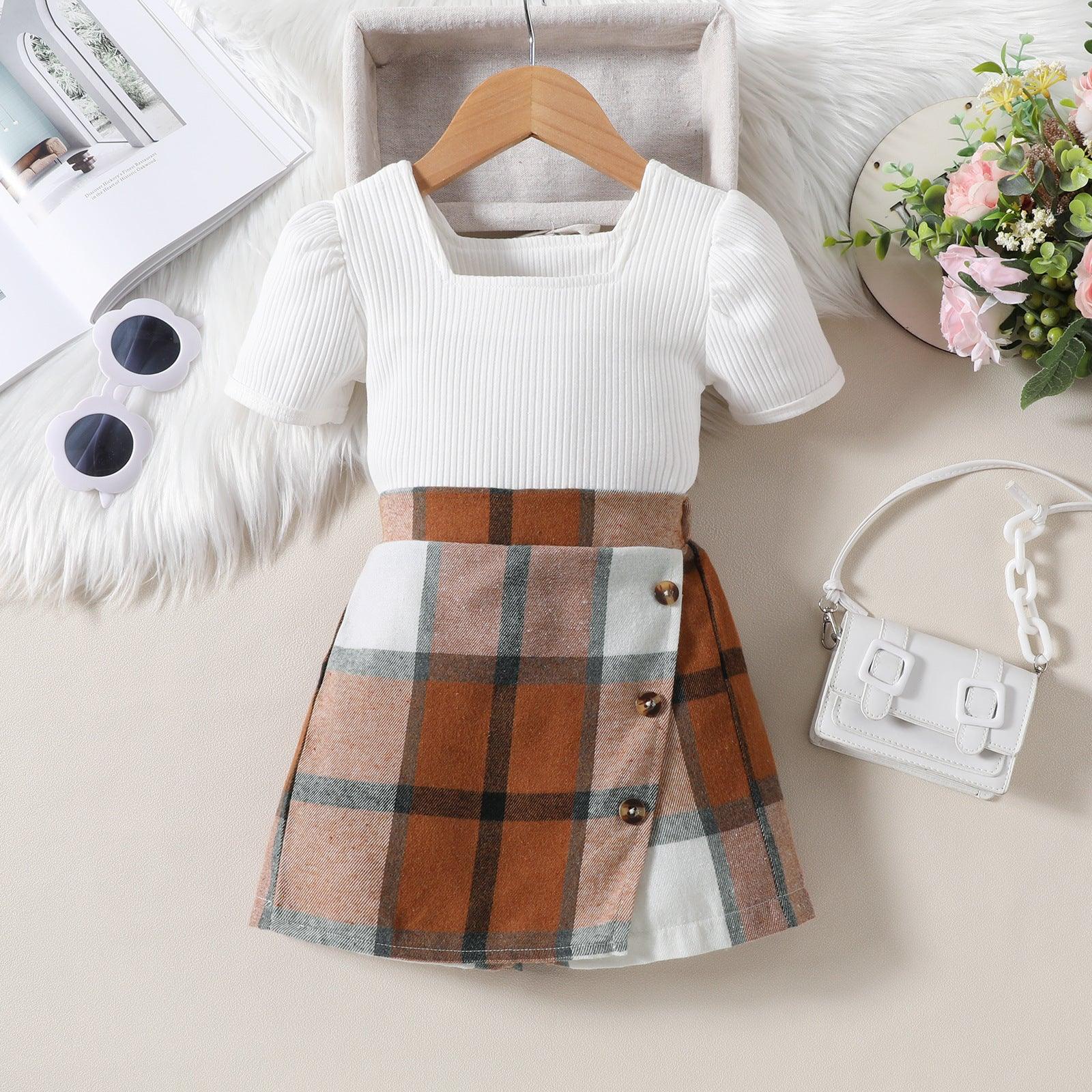 Rib Fabric Puff Short Sleeve Top Irregular Plaid Short Pantskirt Suit