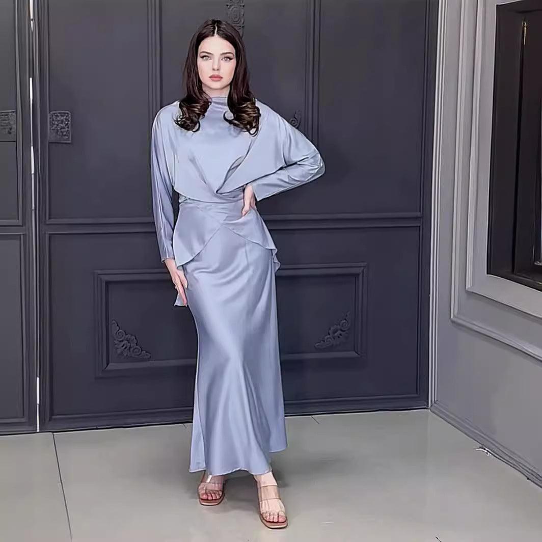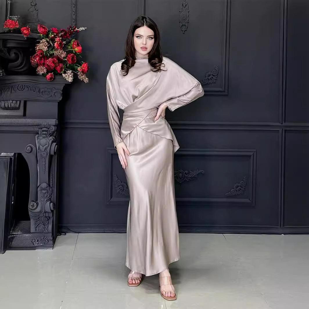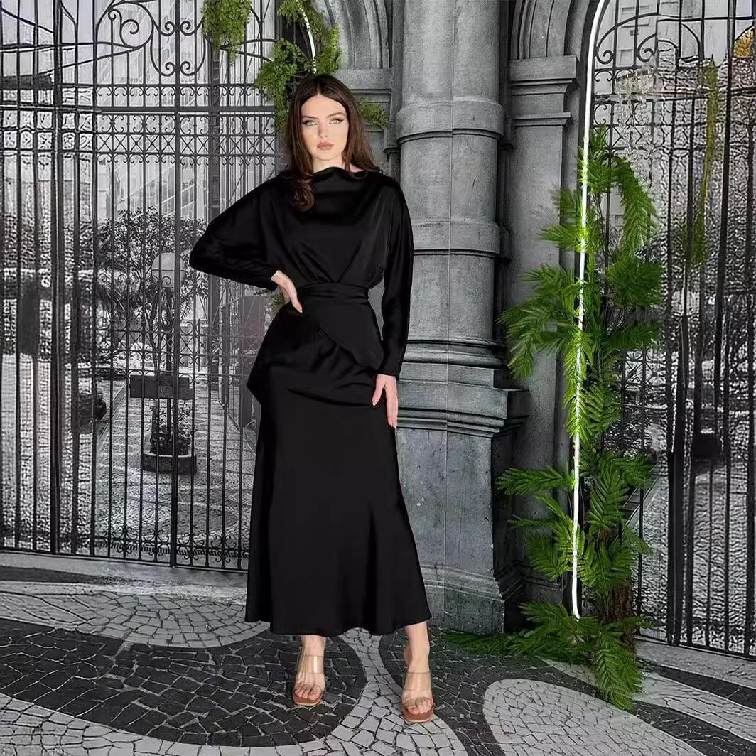 Satin Temperament Bandage Long Sleeve Pullover High Waist One-step Skirt Suit