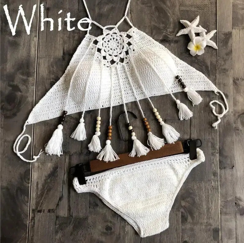 Sexy Crochet Halter Bikini Top with Beaded Tassels