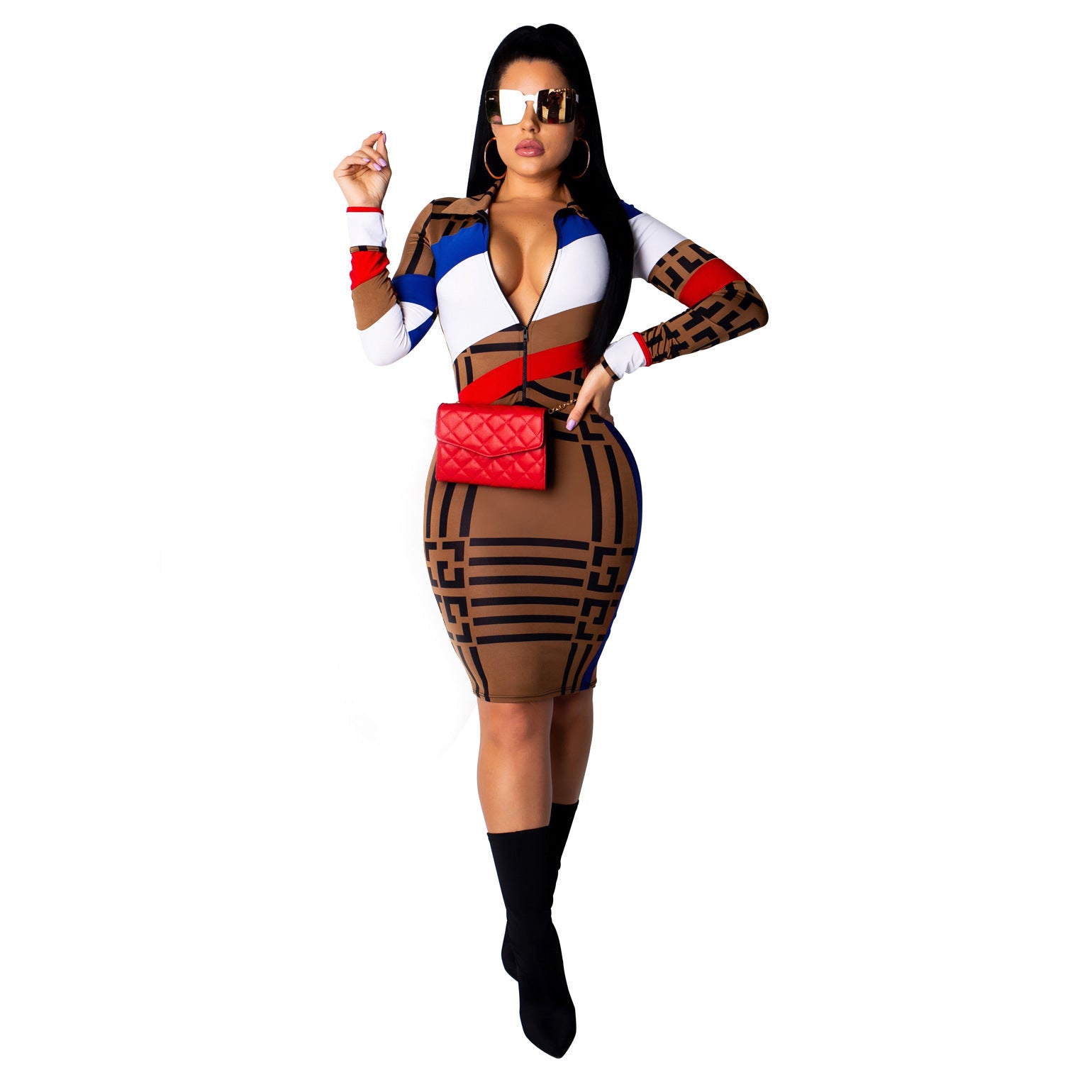 Sexy Multi-color Mosaic Long Sleeve Printed Dress