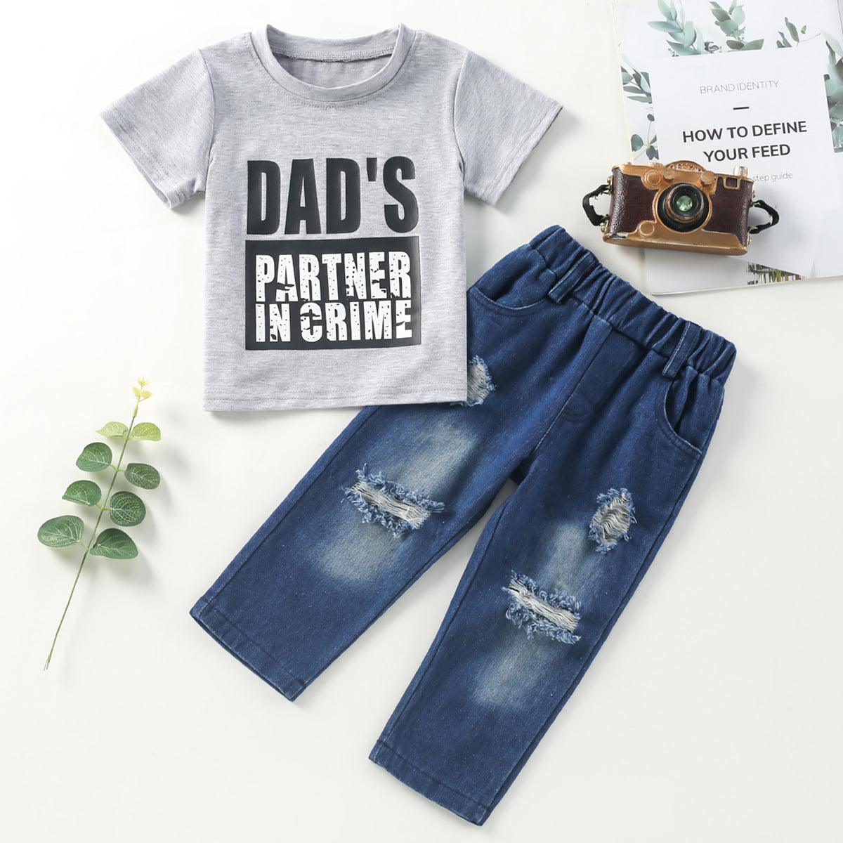 Solid Color Letter T-shirt Denim Ripped Trousers Suit