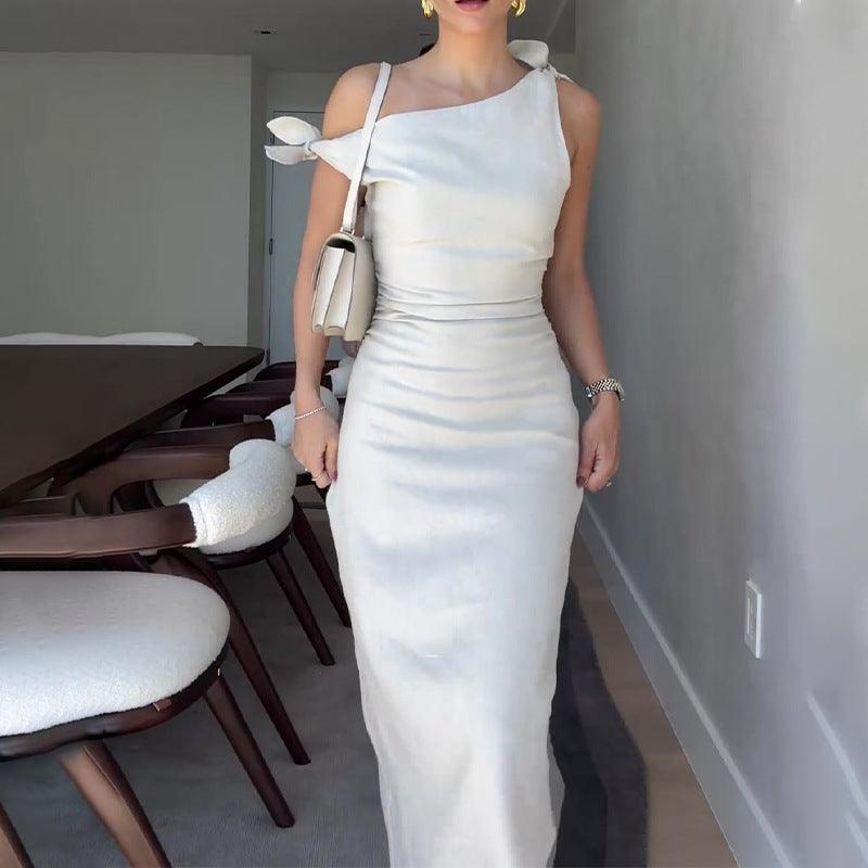 Summer French Style Temperament Slant Shoulder Bundle Waist-tight Temperament Slimming Dress