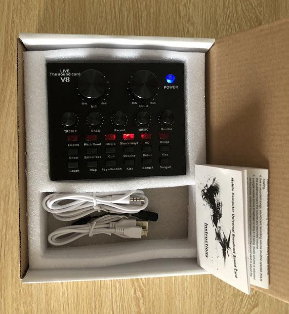 V8 sound card phone electric sound card function: 12 kinds of electric sound, 12 kinds of sound effects, 6 kinds of effect modes, reverb size adjustment, microphone volume adjustment, treble and bass adjustment, recording volume adjustment, music volume adjustment, monitor volume adjustment ). Support mobile phone computer use, support separate headset use, 7 kinds of connection methods: single mobile phone K song live broadcast, dual mobile phone live broadcast, three mobile phone live broadcast, mobile computer simultaneous live broadcast, single computer live broadcast, computer accompaniment mobile live broadcast, instrument input mobile live broadcast.