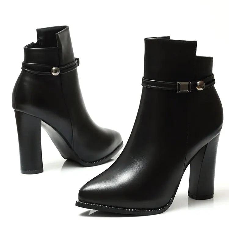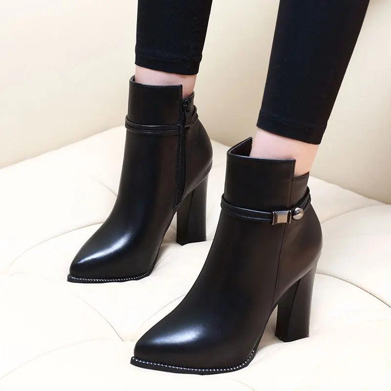 Women 7CM/9CM High Heel Pointed Toe Ankle Boots Fashion Zipper Dress Boots Short Plush Winter Black Split Leather Shoes G0000