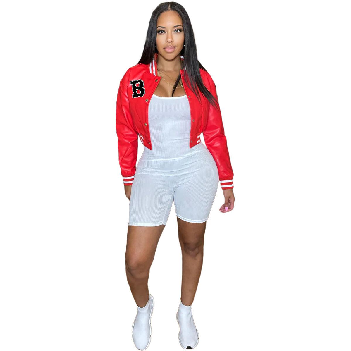 Women's Color Matching Thread Leather Baseball Uniform Coat Top