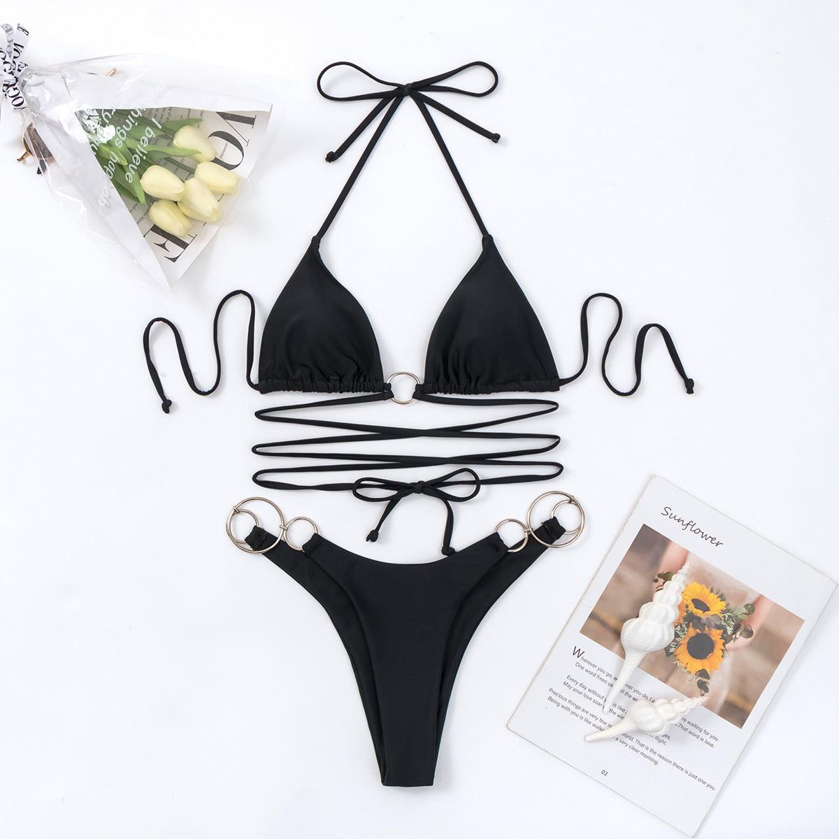 Women's Solid Color Metal Ring Long Strap Split Bikini Swimsuit Set