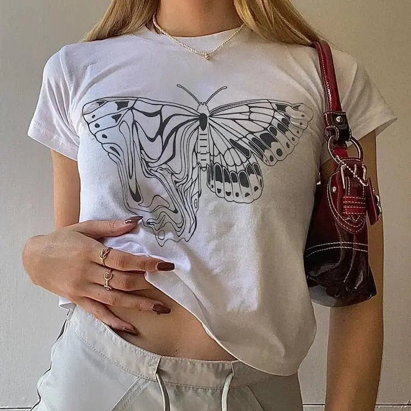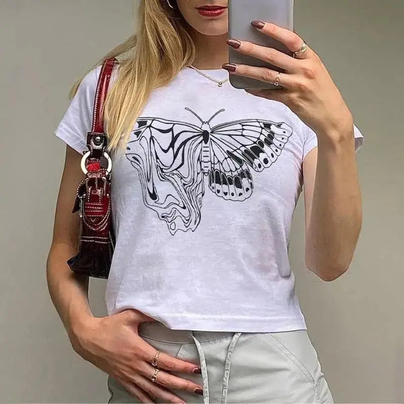 Y2K White Butterfly Graphic Printed Tee